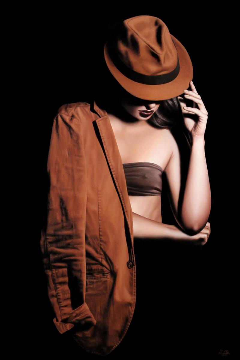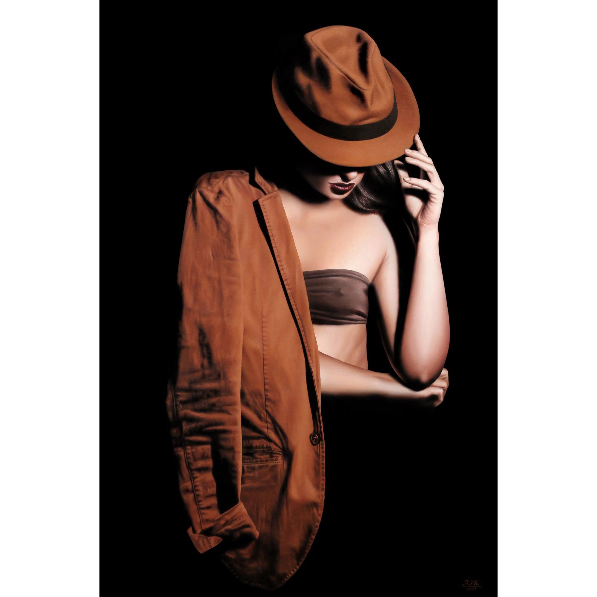 Wrapped in deep shadows and warm tones, Autumn captures the delicate balance between strength and softness. The figure, partially concealed beneath a hat and oversized jacket, becomes a quiet symbol of introspection and presence. The setting is stripped to the essential, leaving space only for the breath of the moment. Like the season itself, the scene is intimate, reserved, yet rich with personality and quiet transformation. The piece is executed with meticulous technique: every detail (from the fold of the fabric to the light on the skin) is the result of careful control of color and time.