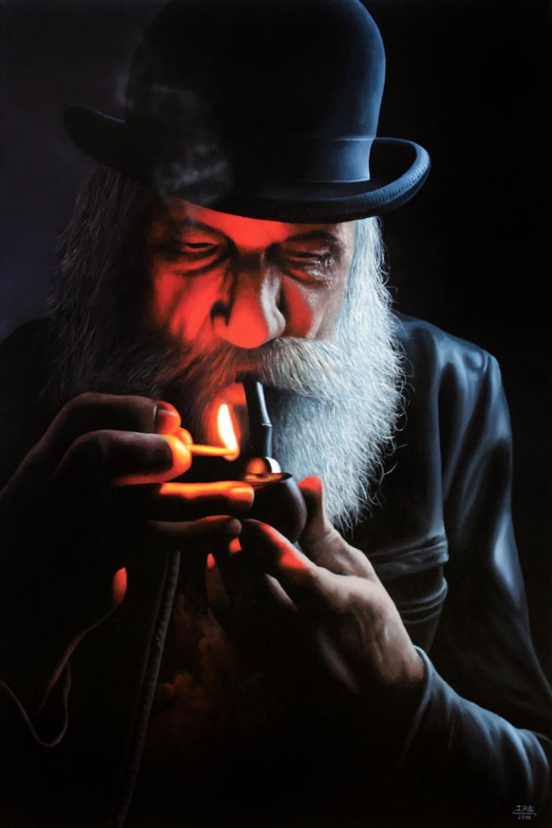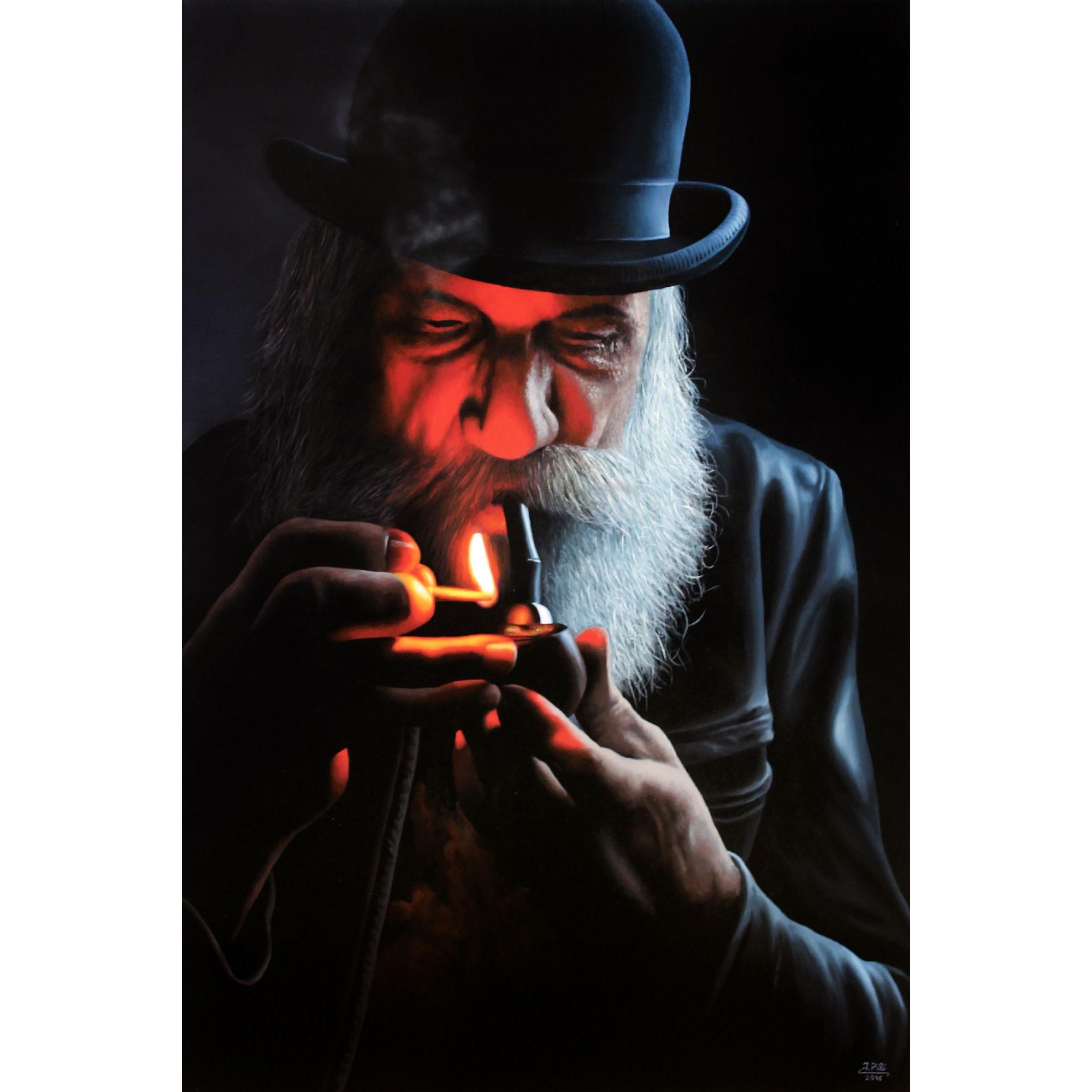 This painting captures a moment of quiet ritual: a man lighting his pipe, wrapped in darkness and memory. The flame gently illuminates worn hands and a weathered beard, while the face remains partly hidden beneath the shadow of a bowler hat. The title “He had a hat, but no head” adds a layer of surreal ambiguity, suggesting absence, loss, or the fading of identity. With masterful use of light and realism, the artist transforms a simple gesture into something introspective and cinematic. This is not just a portrait—it’s a silent question, an image that lingers. What remains when presence dims? What truths hide in the glow of habit? A visual whisper, slow-burning and unforgettable.