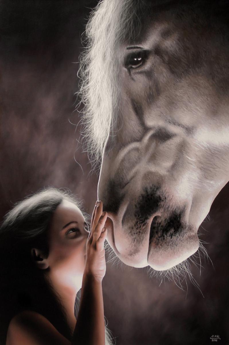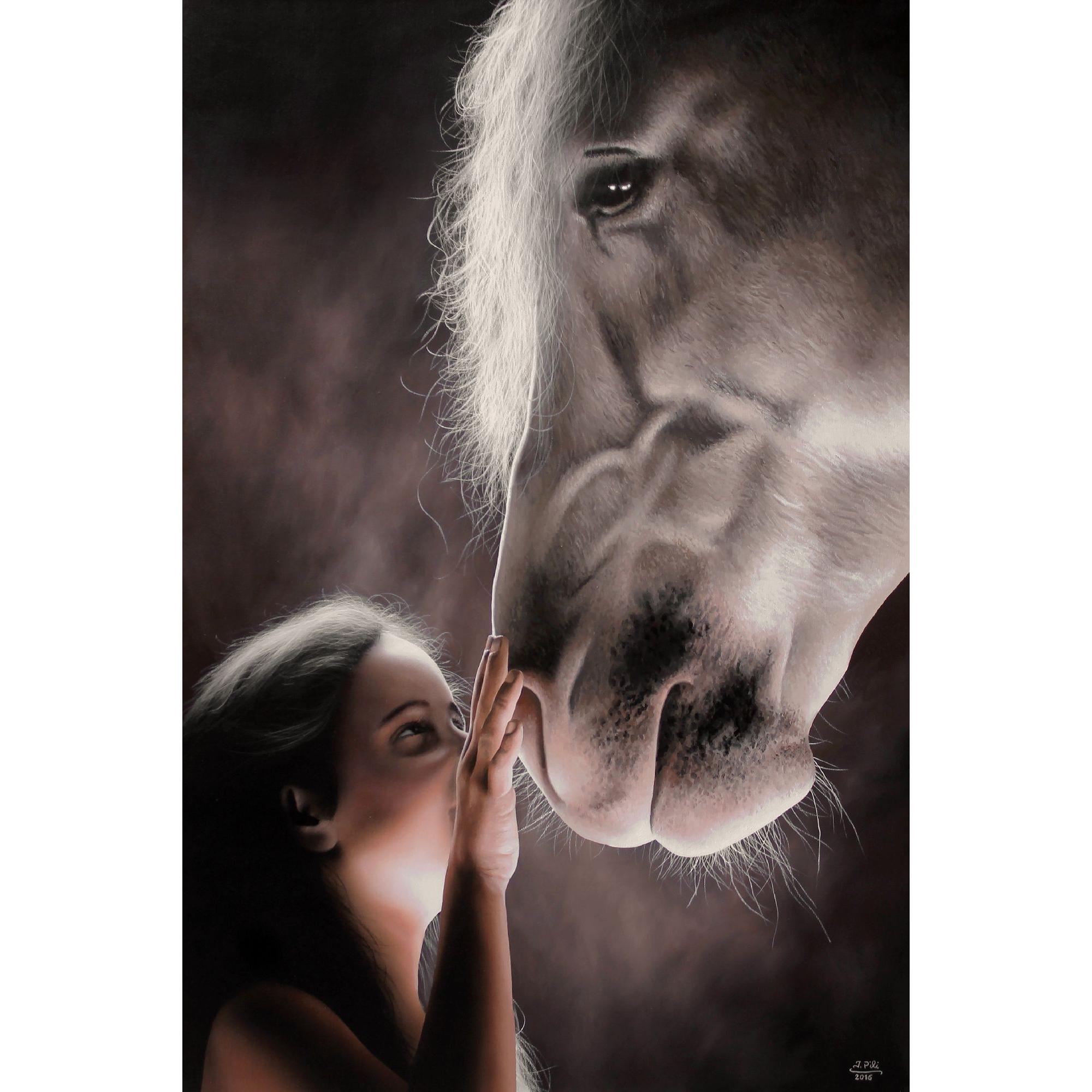 This work captures a moment of tender connection between a young girl and a majestic white horse. The young girl's face expresses a deep and immediate affection. The choice to illuminate the subjects both from below and above creates a suggestive backlighting effect, which envelops the scene in an almost ethereal atmosphere, enhancing the purity and spirituality of the shared moment. The artist, with considerable technical skill, manages to convey the softness of the horse's coat and the girl's delicate expression of care, inviting the viewer to reflect on the instinctive nature of affection and non-verbal communication between living beings. The painting, with its meticulous attention to detail and innovative use of light, not only celebrates the beauty of the interspecies bond, but also lifts a veil of mystery on the hidden emotions that such a simple gesture can reveal.