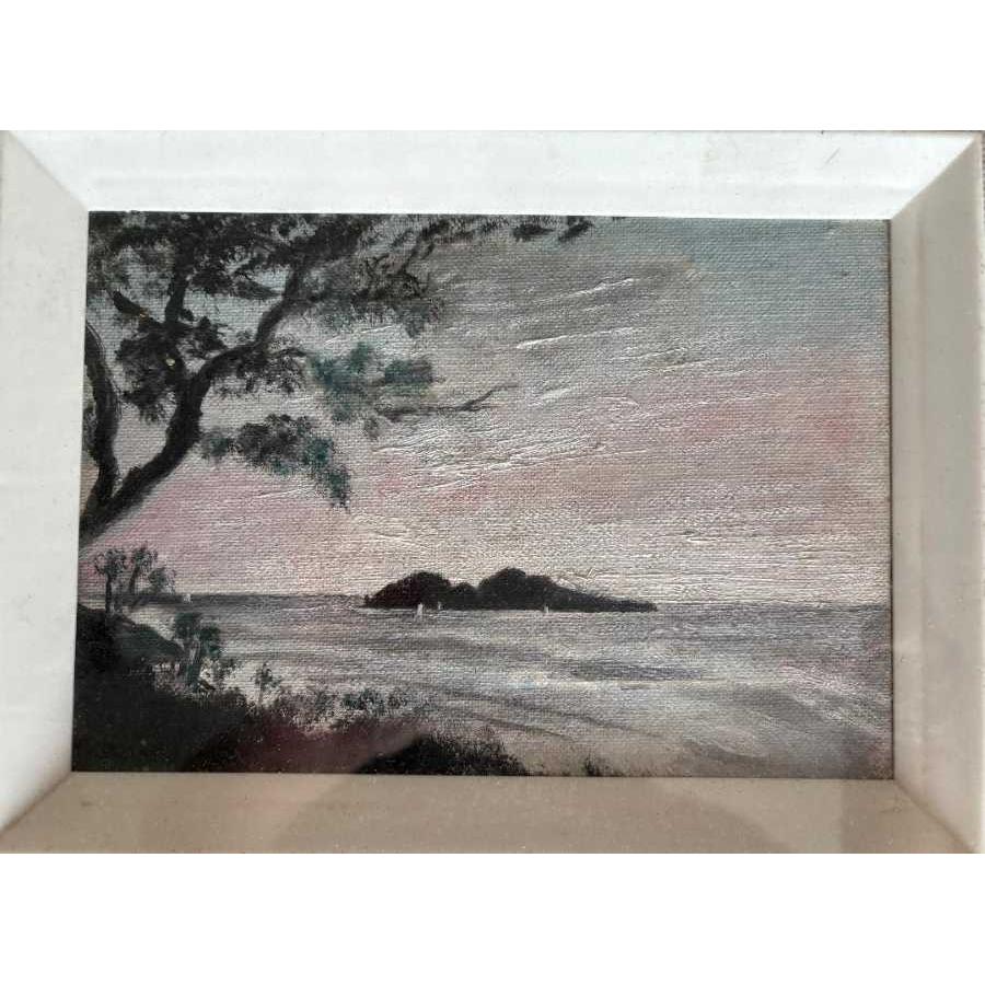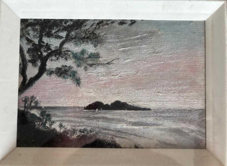 Questo piccolo quadro raffigura Capri al Tramonto. il mare è calmo ed il cielo è dipinto con pennellate nei toni del grigio, rosa e lilla creando una atmosfera quieta e contemplativa.