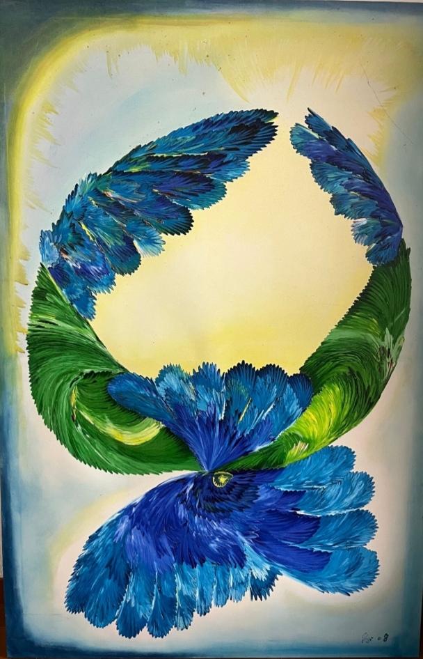 Il blu e il verde si rincorrono come due respiri che si fondono: il blu è la calma, la profondità dell’anima; il verde è la vita che nasce, cresce e si rinnova.Al centro, un punto di luce racchiude il nucleo di tutto: la protezione, il calore, la presenza che non smette mai di avvolgere.