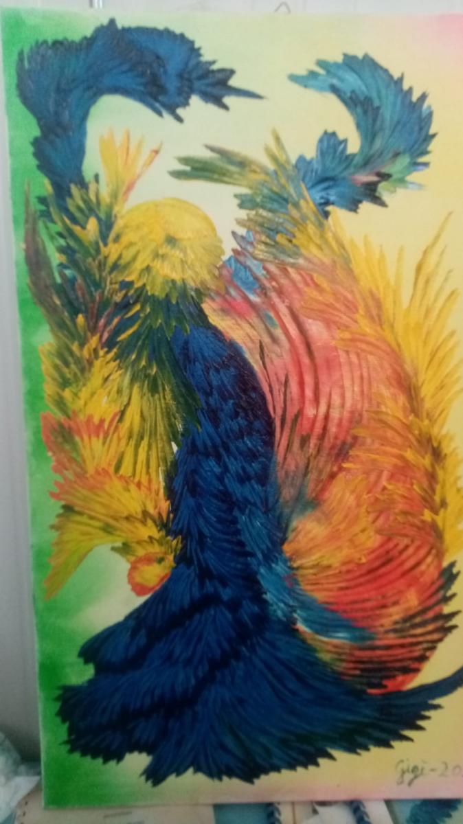 Quest’opera è nata dal bisogno di rappresentare un luogo dell’anima, uno spazio interiore dove tutto trova armonia.Con la spatola ho lasciato che i colori si muovessero liberamente, creando una danza di forme che si incontrano, si abbracciano e si fondono. Il blu profondo si intreccia con il giallo e il rosso in un equilibrio vitale, come correnti che si attirano e si sostengono a vicenda.