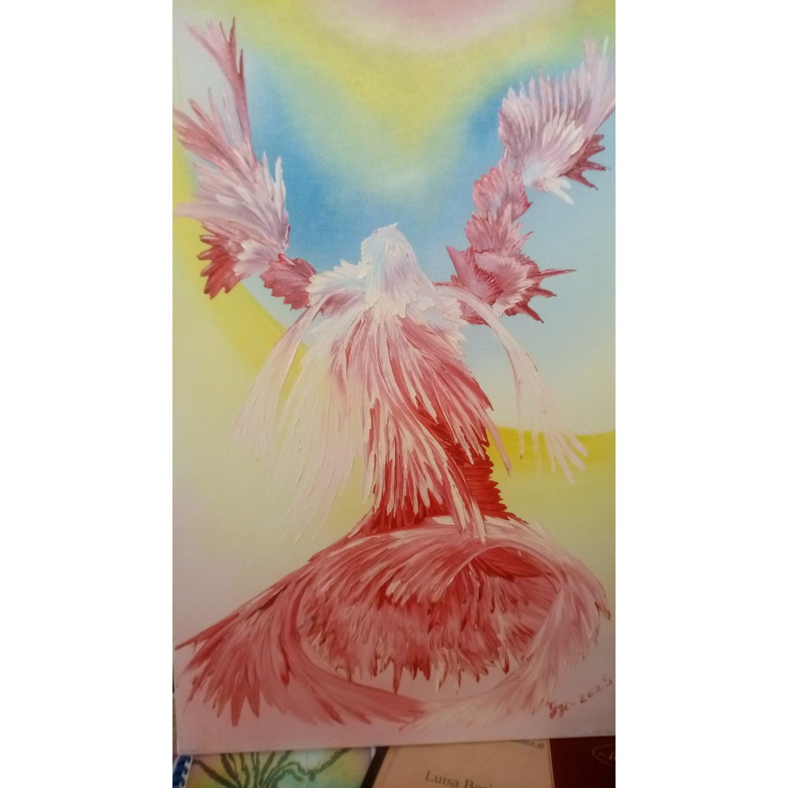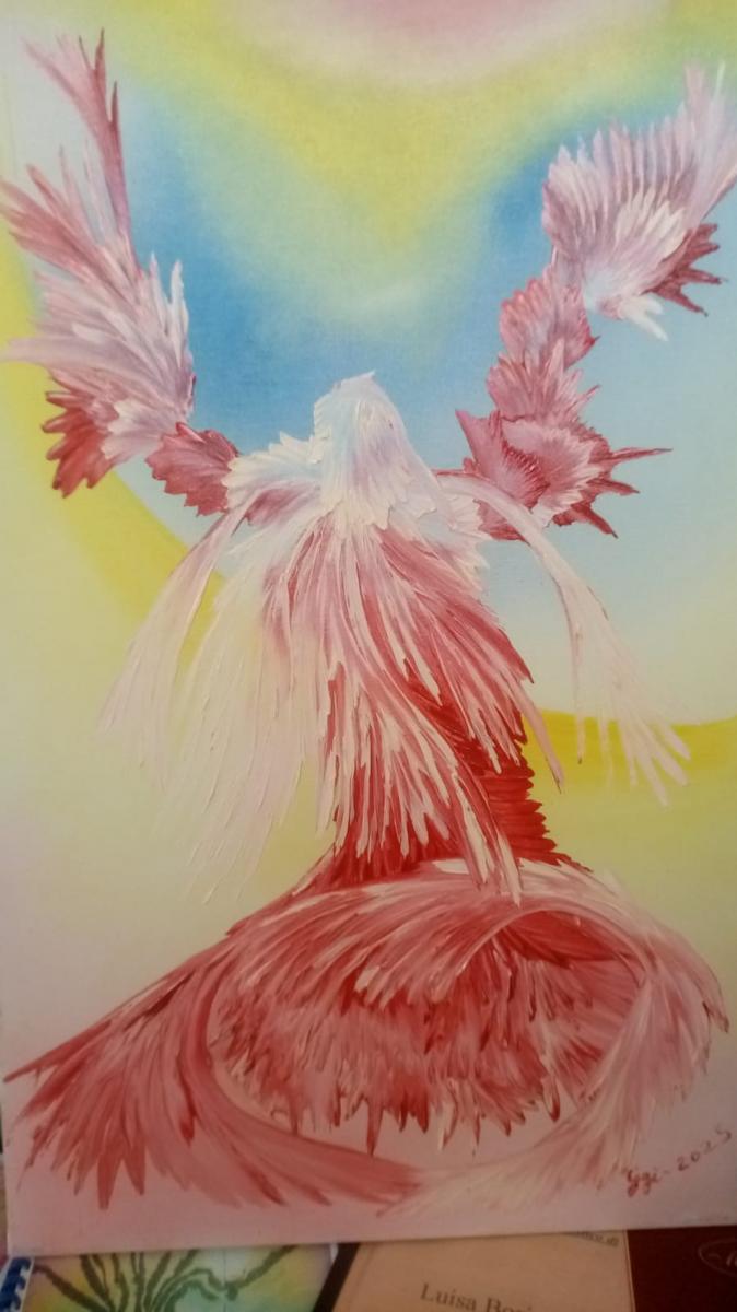 Con la spatola ho cercato di dare corpo all’anima che si risveglia — fatta di rosso, di calore, di passione, ma anche di bianco, di pace e di purezza. È la forza della vita che riaffiora, la consapevolezza di poter ancora fiorire dopo l’ombra.