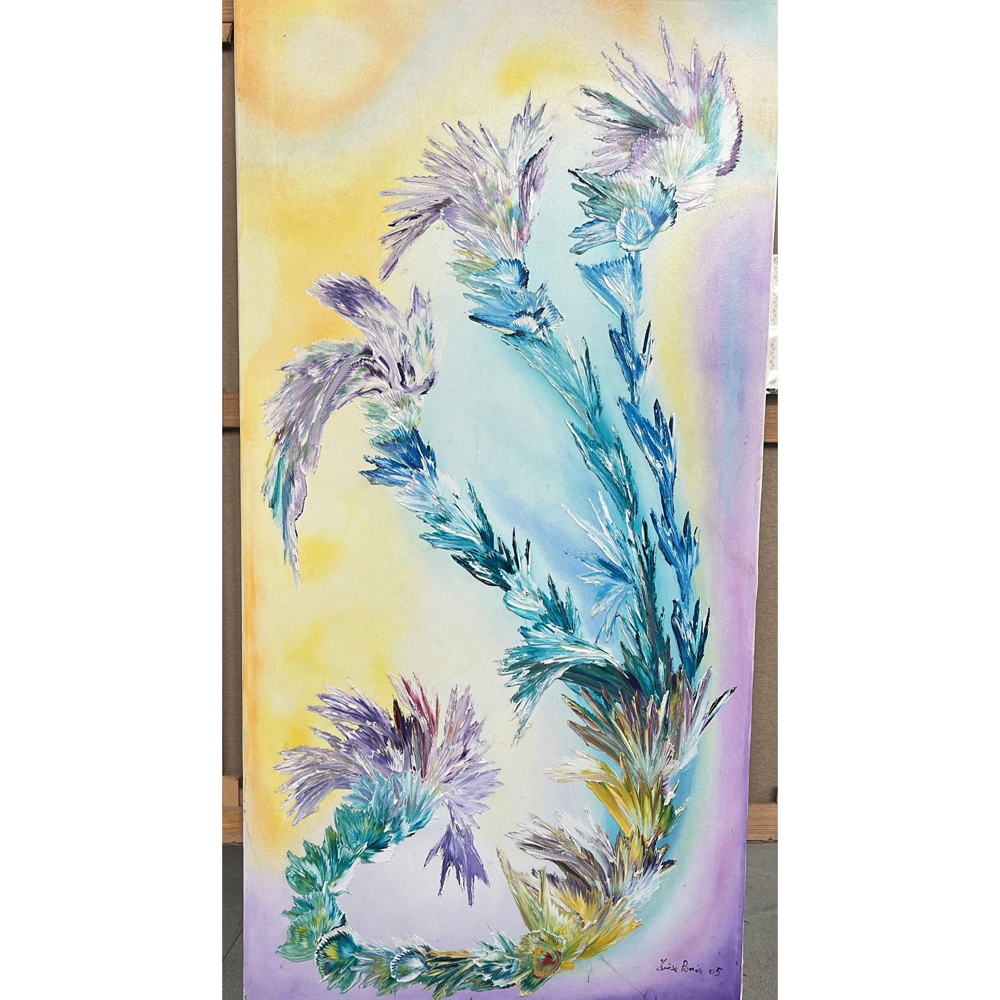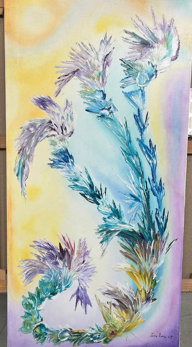 Il titolo è una mappa di sensazioni: Il profumo della vita è ciò che cerco di lasciare impresso con ogni gesto. Non racconto, propongo un’esperienza — un invito a mettere il naso vicino alla pittura. Le spatolate d’olio creano un rilievo che assomiglia allo svolgersi di petali; il turchese e il verde giocano come foglie fresche, il lilla e il blu fanno da cuore e il giallo dà la nota calda che trattiene l’attenzione, come una scia olfattiva che persiste. C’è un movimento circolare, un’onda che parte dal basso e ritorna, come chi raccoglie e offre un mazzo di ricordi profumati.