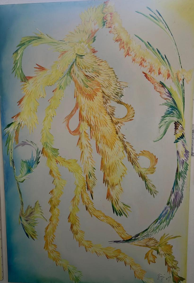 L’ho dipinto in un periodo di dolore fisico, con la necessità di trasformare la fatica in un gesto che potesse parlare più della voce. L’opera è una dichiarazione intima rivolta al cielo: nel sole verrò da te è la promessa che ho mormorato mentre lavoravo, ogni spatolata un passo verso una luce che non è fuga ma incontro. Non volevo fare un’immagine sacra, volevo voltare il dolore verso qualcosa di caldo e accogliente.