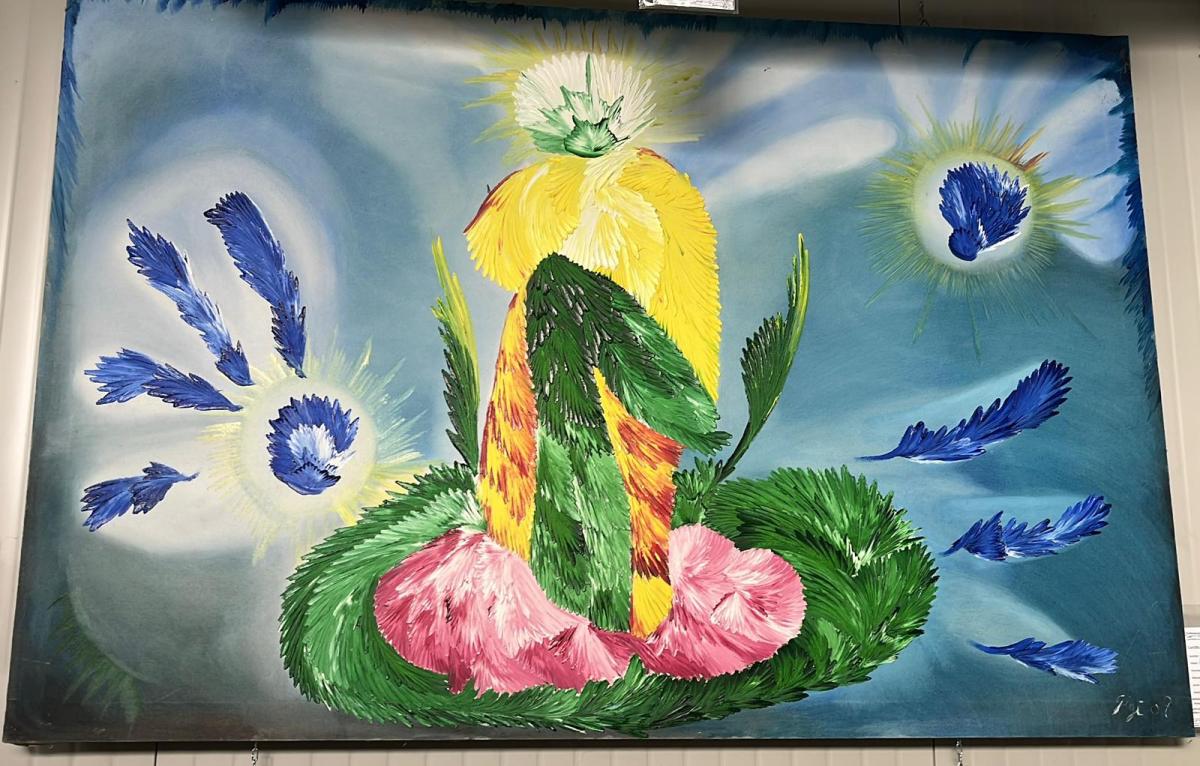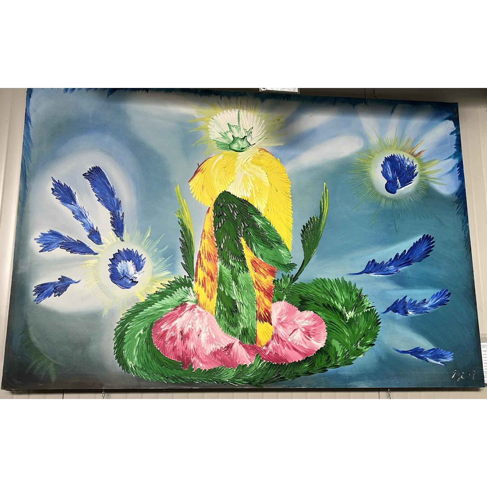 Le spatolate sono stati pianti tradotti in gesto: rapide, decise, a volte carezzevoli, a volte tagli che però non lasciano senza cura. Il verde che avvolge la base è una terra che mi accoglie; il rosa è un cuscino dove posare la testa; il giallo è un cerchio di calore sopra di me, una luce che non chiede miracoli ma solo presenza. I frammenti blu che volano attorno sono respiri che lascio andare e che qualcuno — forse lui — raccoglie per me. Nel mezzo c’è una figura che guarda dall’alto: non è giudizio, è attenzione.