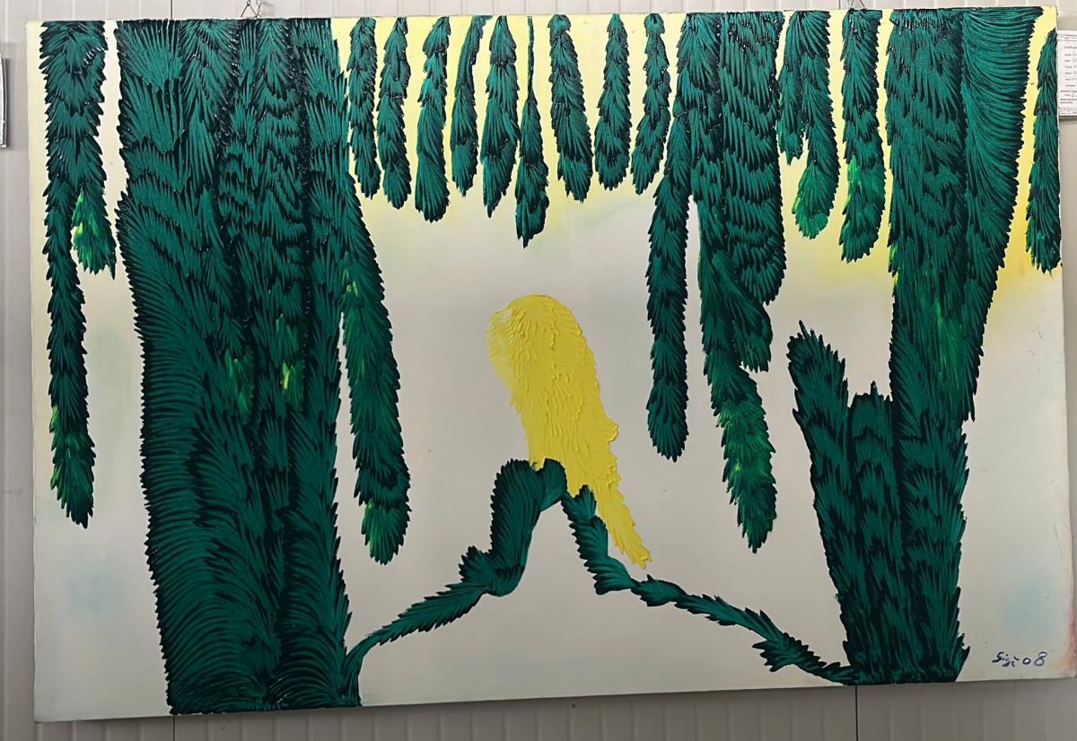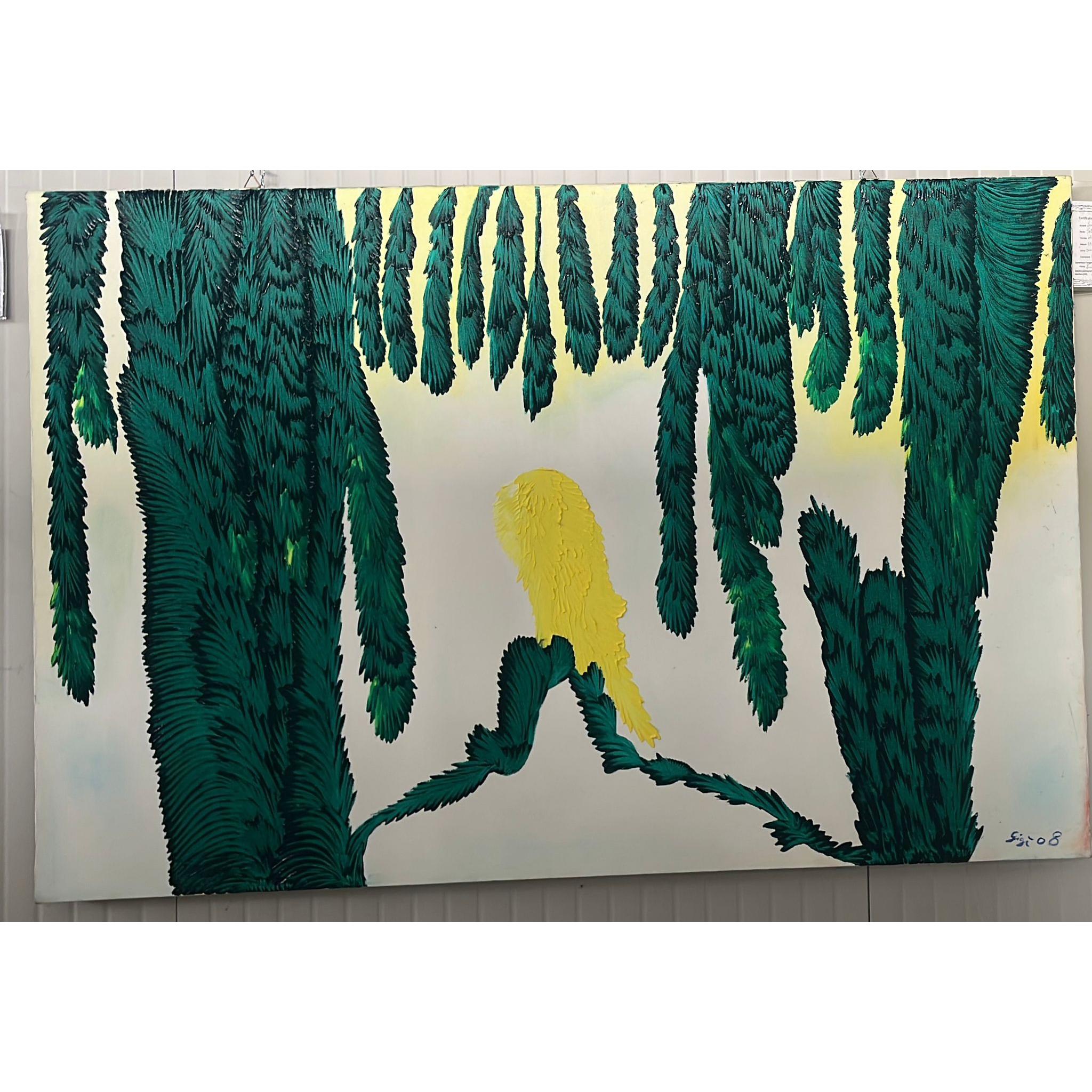 L’ho dipinto per restituire esattamente il luogo dove mi ritrovo: i miei boschi. Qui mi rappresento così, senza volto ma con il corpo fatto di foglie e gesti — perché quando sono tra gli alberi non mi riconosco più come prima, divento solo ascolto e passo. Le spatolate verdi avvolgono la figura centrale, il giallo che le fa da cuore è la luce che mi segue quando cammino tra i tronchi.