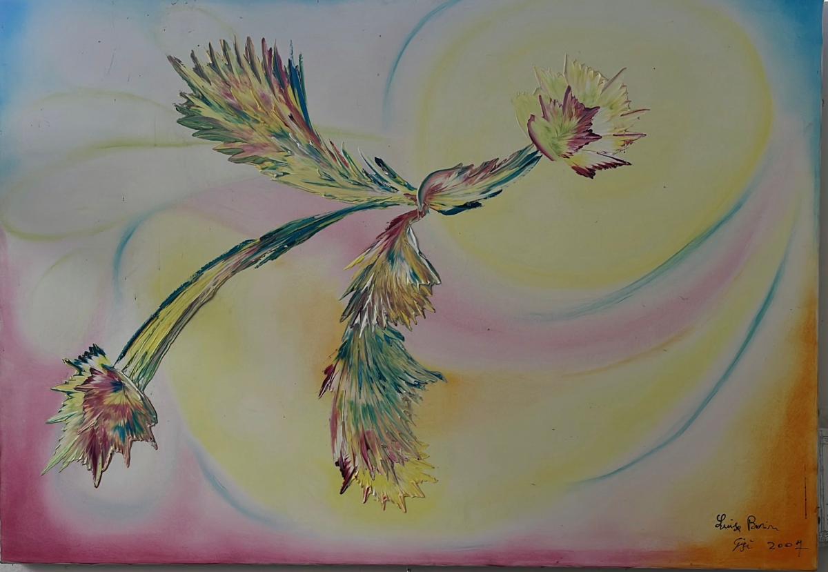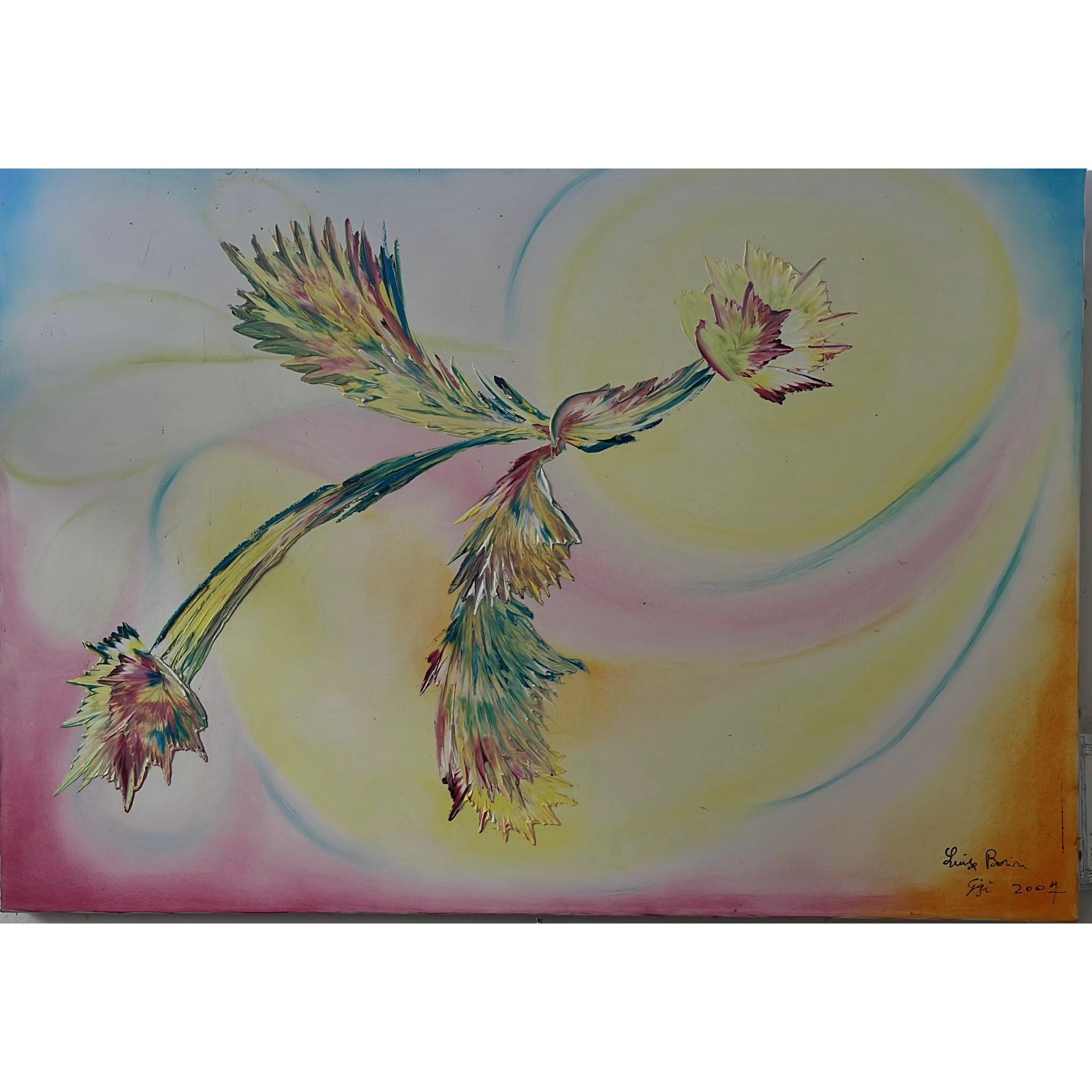 L’ho dipinto come un atto di libertà: Nel sole è la dichiarazione che volevo volare senza briglie, senza dover rendere conto a nulla se non al mio respiro. Ho preso la spatola e ho lasciato che il gesto tracciasse ali leggere — colpi sottili e materici che si allungano come piume mosse dal vento — su uno sfondo che si apre in cerchi di luce. Il giallo caldissimo del sole si fonde con rosa e azzurro in sfumature che non fissano confini ma aprono corridoi d’aria; i toni pastello non sono pudore, sono spazio: lo spazio in cui scegliere la propria rotta.