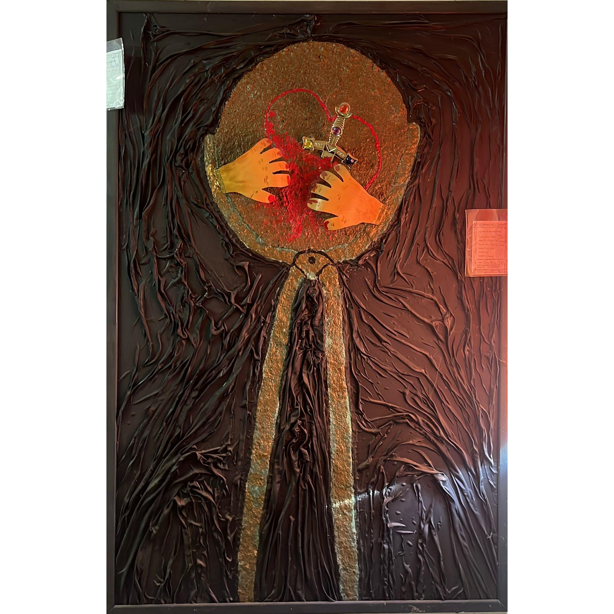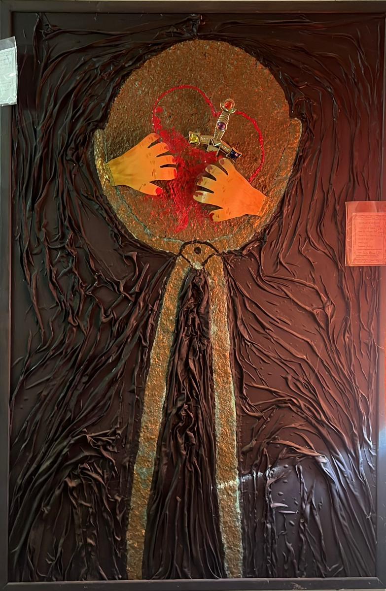 Lo stupro del pianeta è nato dall’urgenza di rendere visibile una violenza che sento dentro e intorno a me: non volevo illustrare dati o colpe, volevo dare corpo al rumore del saccheggio. Ho lavorato con seta, resine, rame per le mani e il pugnale, e terra vera a rappresentare il mondo — materiali che portano con sé peso, odore e storia — e li ho disposti come se fosse una scena crudele e quotidiana. Le pinze reggono la sfera della terra come se fosse un bottino; due mani la dividono e un pugnale la lacera: gesti concreti che parlano di avidità, ricchezza che devasta, consenso che legittima la ferita.