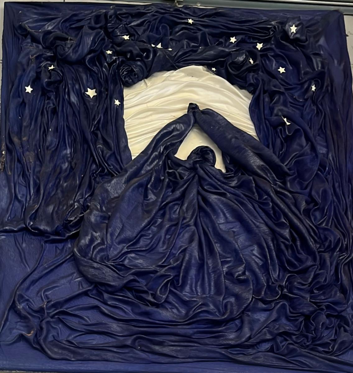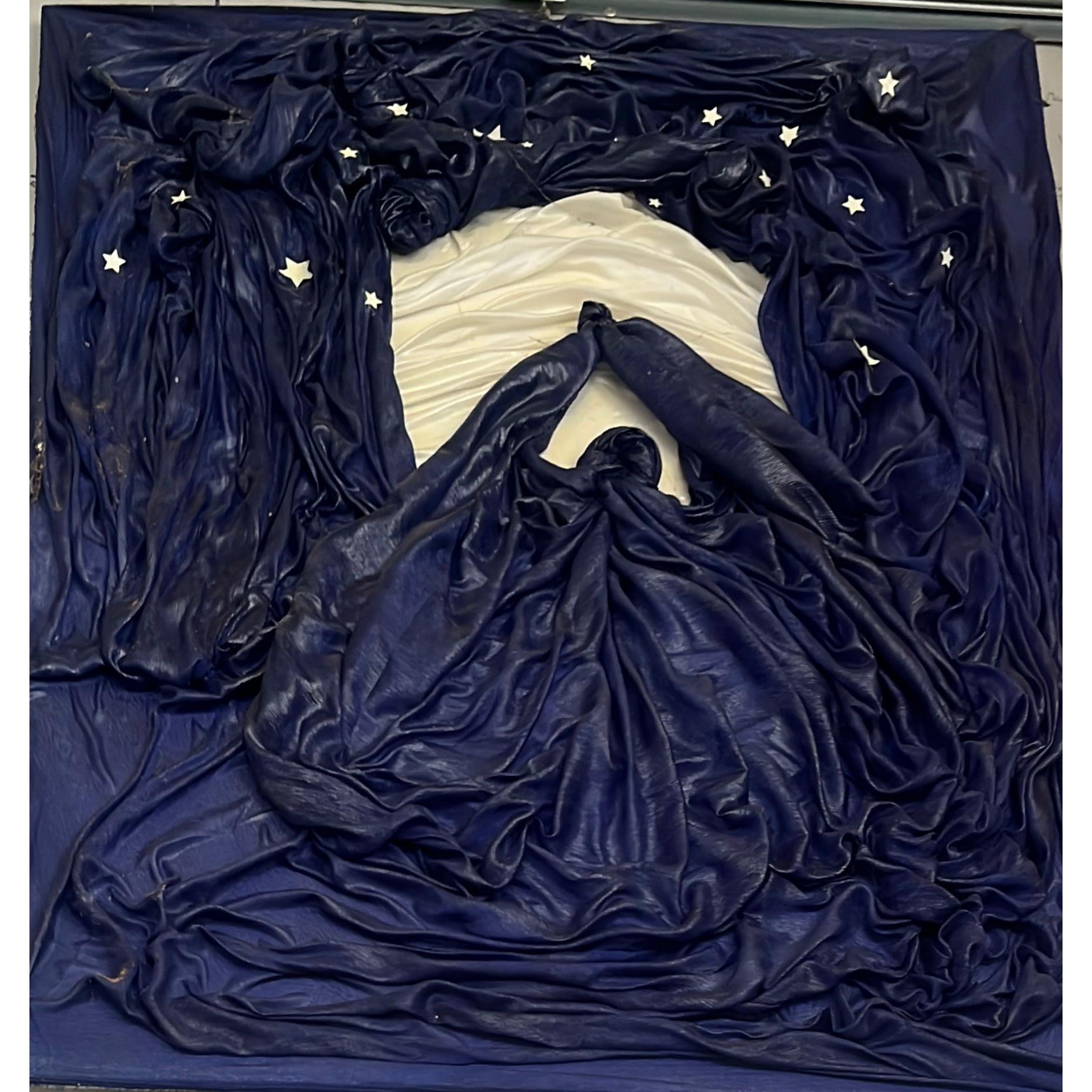 L’ho creato come una mappa di notti in cui cercavo te. Ho preso stoffe scure, le ho piegate e fissate perché diventassero cielo: ogni piega è un passo che ho fatto con le mani per trovare un punto dove posare il mio saluto. Le stelle non sono disegnate, le ho adagiate come piccoli lembi di luce che punteggiano il buio e indicano la direzione in cui guardo.