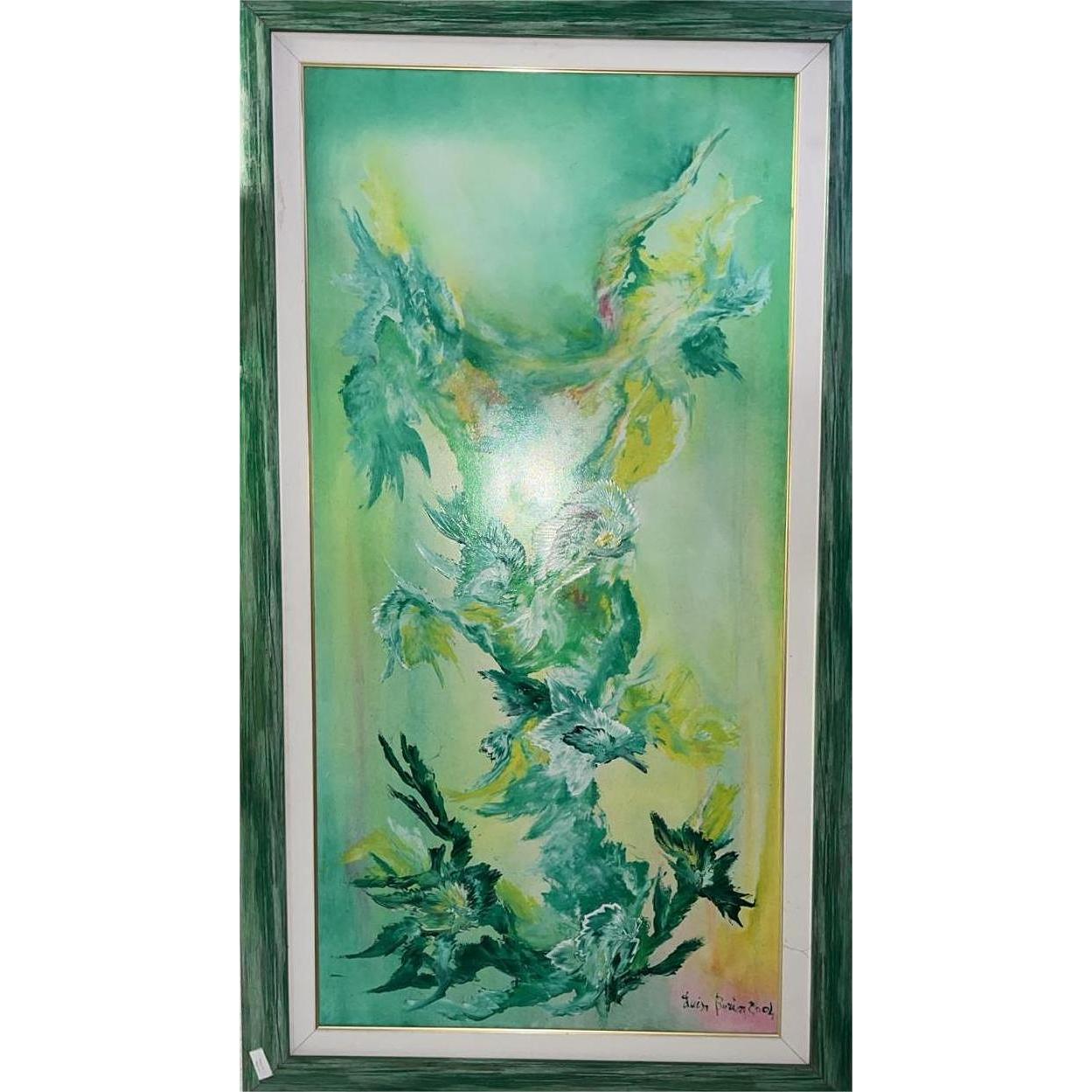 L’ho dipinto come un passaggio: L’addio non è un arrendersi, è il momento in cui ho deciso che il dolore non avrebbe più avuto l’ultima parola. Le forme verdi che si sollevano come correnti d’aria sono la mia promessa: continuo a camminare, continuo a guardare avanti. Il giallo che emerge tra le pennellate non è una ferita, ma una luce che prende forza, la consapevolezza che ciò che arriva può essere migliore di ciò che è stato.