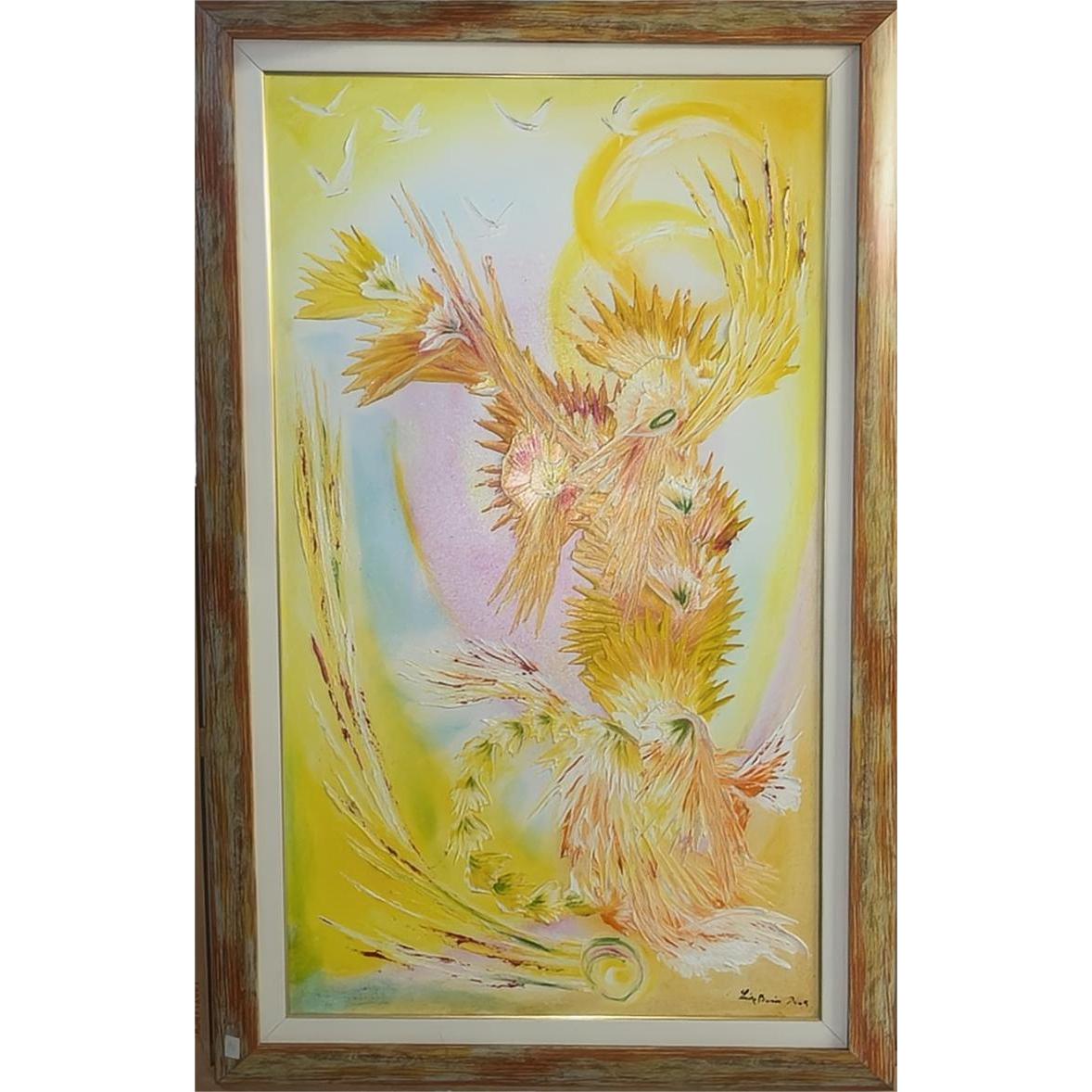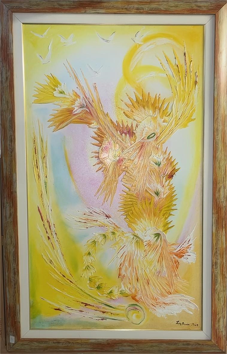 L’ho dipinto in un momento in cui il corpo era fermo, ma il cuore no. Senza catene nasce dal bisogno urgente di sollevarmi oltre i limiti che mi circondavano: non un sogno irrealistico, ma una direzione che già sentivo dentro di me. Le forme dorate e rosate che si innalzano, simili a piume e fiammate leggere, sono la mia forza che prende slancio, il mio desiderio di andare oltre la carrozzina prima ancora che il corpo potesse farlo.
