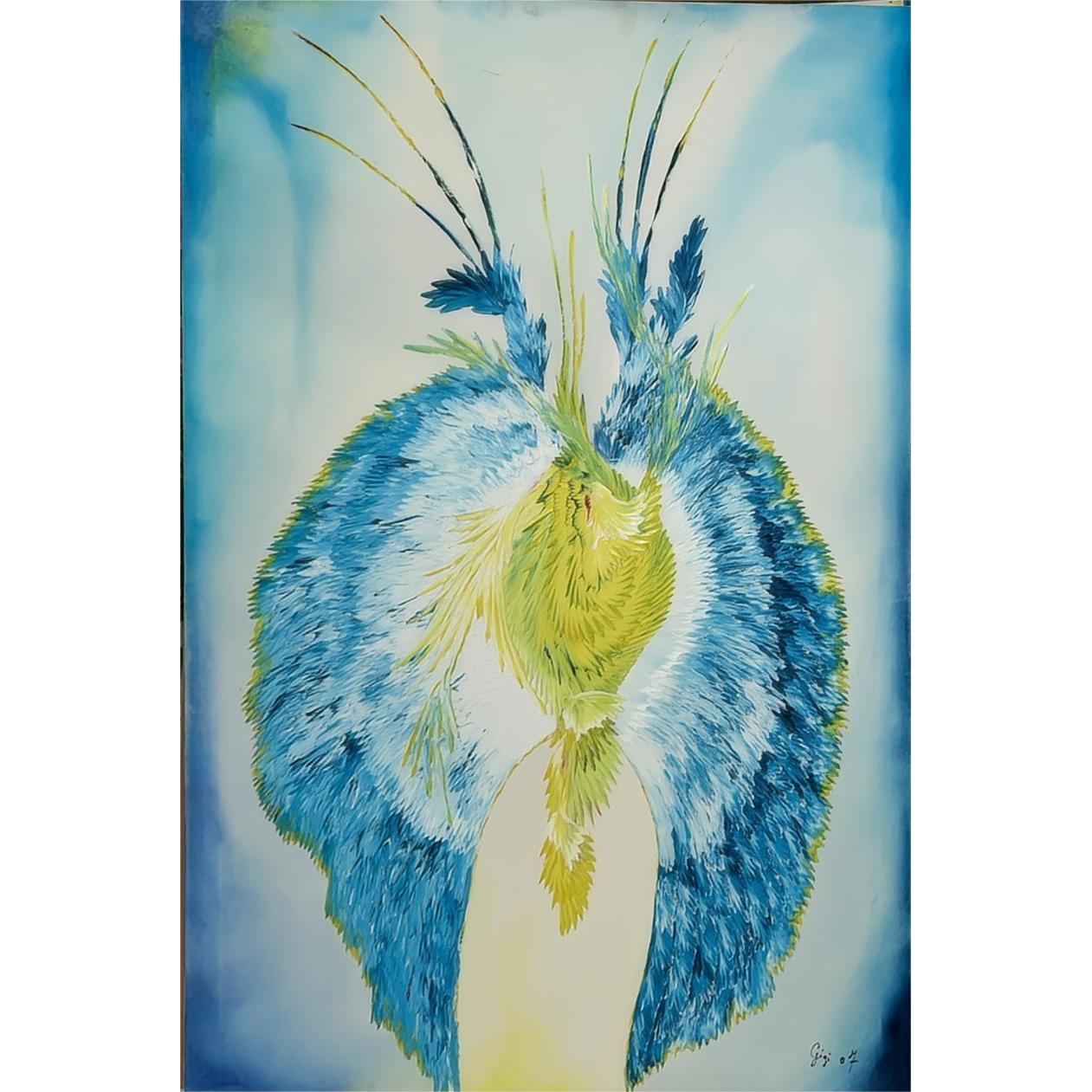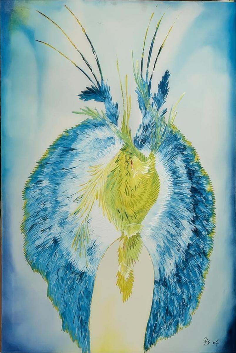 Il blu e il giallo si accarezzano, sfumando nei bordi senza mai chiudere lo spazio: si aprono, si mischiano, creando corridoi d'aria in cui il cuore può davvero volare, leggero e audace. Ogni segno è vibrante, materico, ma mai pesante: c'è la freschezza delle ali che si dispiegano, l'energia di chi non teme di mettersi in gioco. L'assenza di confini netti è la scelta di una rotta sempre nuova, sempre oltre — perché amare, qui, significa non voltarsi indietro ma lasciarsi attraversare dalla luce e dalla vitalità, accogliendole come doni senza limiti.?