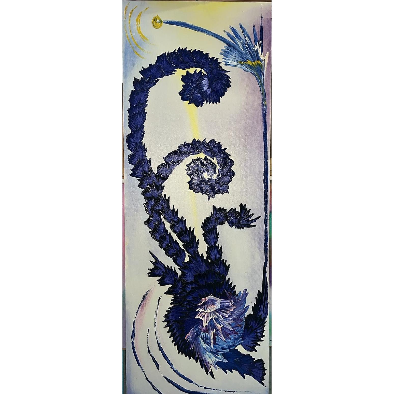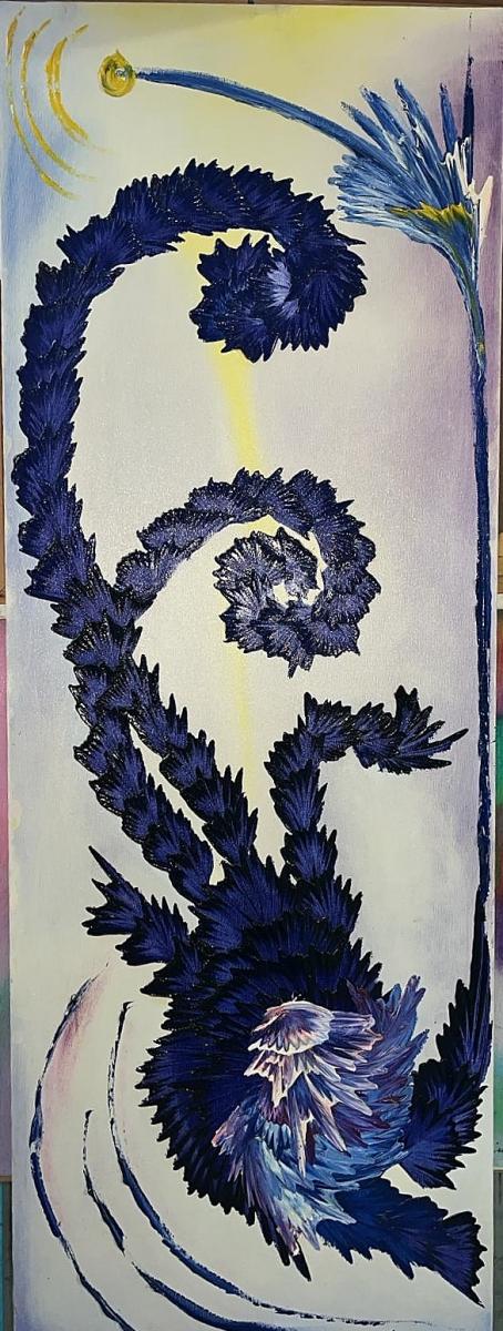 Quest’opera è nata nel silenzio della fede, in uno spazio interiore fatto di ascolto e abbandono. I colori sono profondi, raccolti, attraversati da una luce discreta che non invade, ma accompagna. Le forme sembrano orbitare, come presenze sospese, come pensieri che cercano un centro.