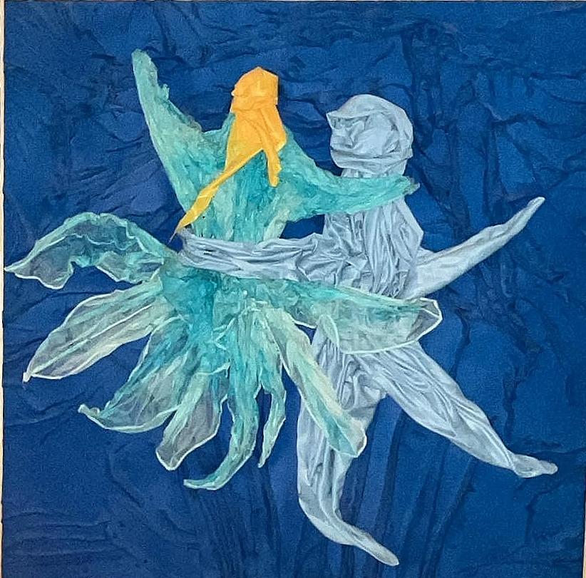 La vita è movimento continuo, non concede pause, e io ho scelto di danzarla. In quest’opera danzo con mio marito, perché l’esistenza, quando è condivisa, trova un ritmo più profondo. La seta scivola come un passo leggero, le resine fermano l’istante prima che svanisca, i collanti tengono insieme ciò che il tempo tenta di separare. È una danza fatta di fiducia, di ascolto reciproco, di silenzi che parlano. Qui racconto l’intimità di due anime che si riconoscono, che accettano di perdersi e ritrovarsi nello stesso movimento, consapevoli che la vera armonia nasce dall’imperfezione.