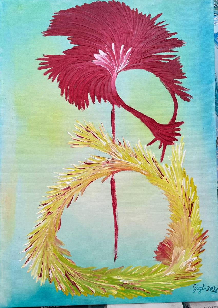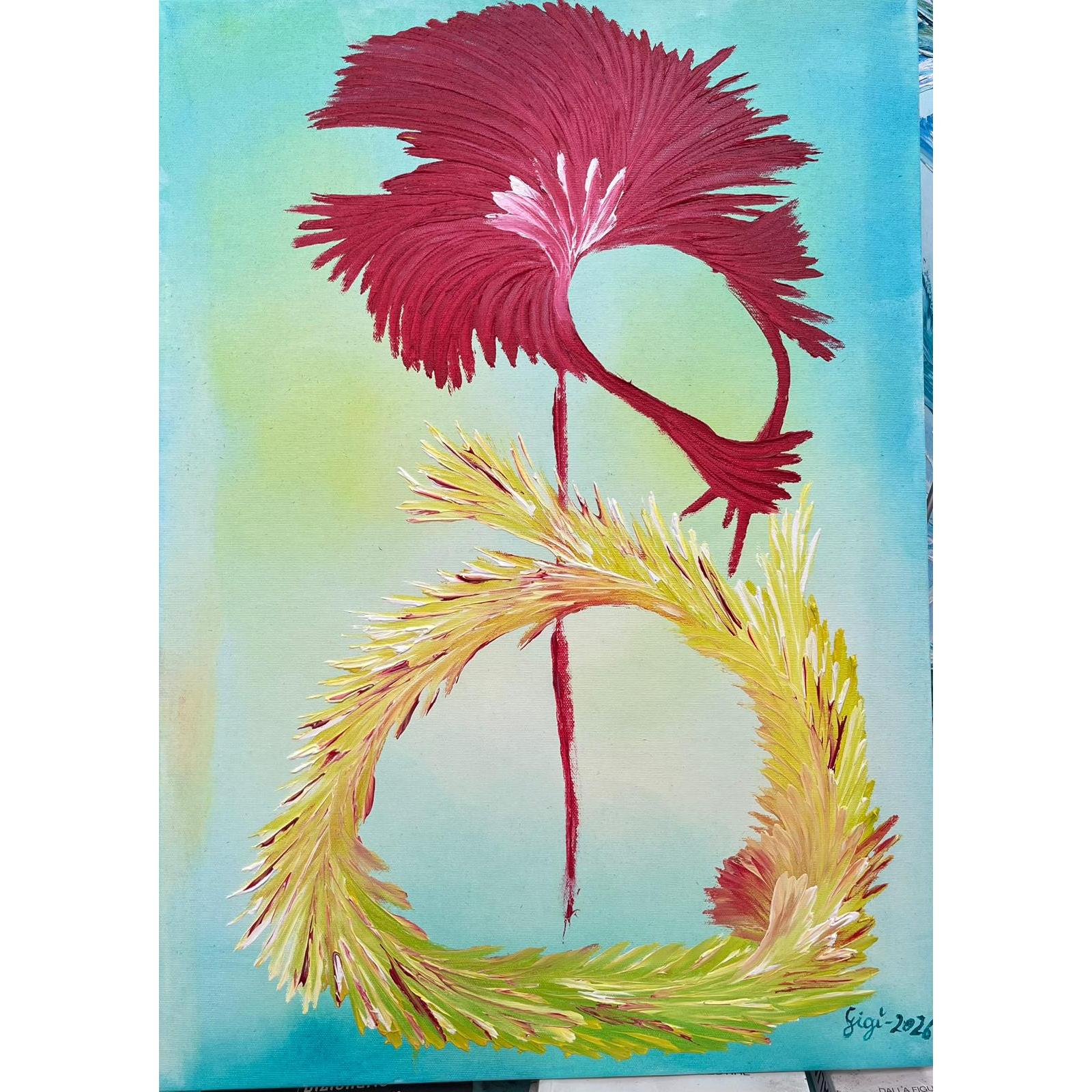 L’istante in cui tutto comincia, quando l’energia prende forma e il respiro entra nel mondo. I colori si aprono come un primo battito, la materia si muove senza paura. È l’inizio assoluto, fragile e potentissimo insieme.