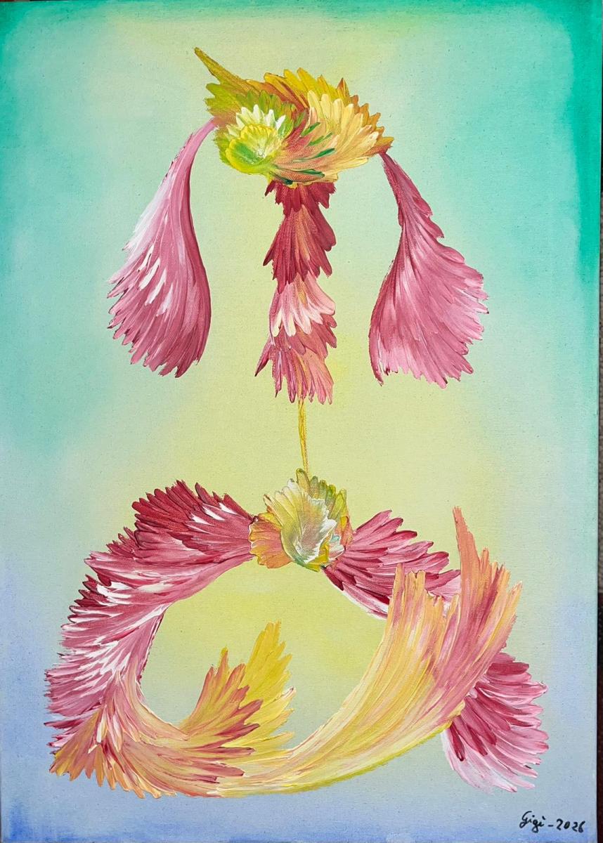 In quest’opera indago la luce come principio vitale e forza generativa. La composizione nasce da un movimento interiore, da una pulsazione invisibile che struttura lo spazio attraverso forme fluide, circolari, sospese tra ordine e libertà, tra materia e vibrazione.