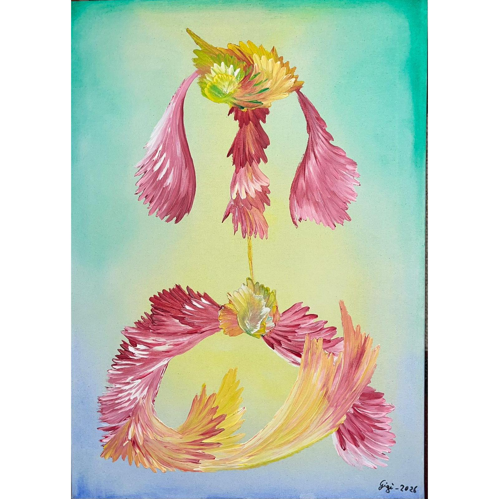 Le pennellate si trasformano in frammenti energetici, in traiettorie di luce che costruiscono un linguaggio simbolico, non descrittivo, dove il colore non è decorazione ma frequenza emotiva e spirituale. I toni caldi dialogano con il fondo etereo creando una tensione armonica tra densità e rarefazione, tra presenza e trascendenza.