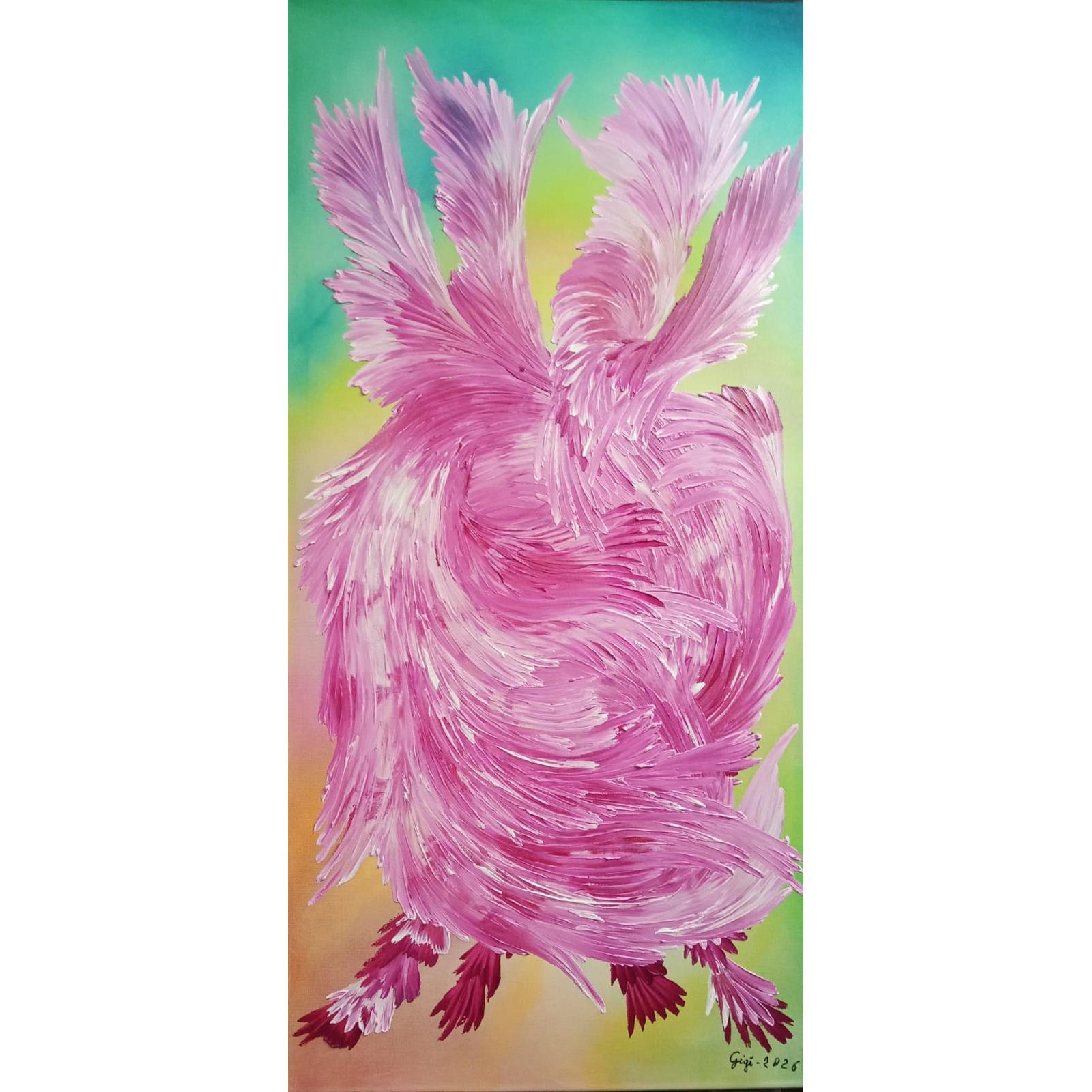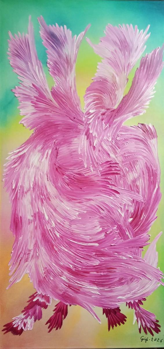 Le pennellate materiche si aprono come ali in espansione, creando un vortice di energia che sembra sollevarsi dalla tela. Il colore rosa-viola attraversa la superficie con gesti fluidi e vibranti, evocando la forza del cuore quando trova il coraggio di liberarsi e di prendere il volo.