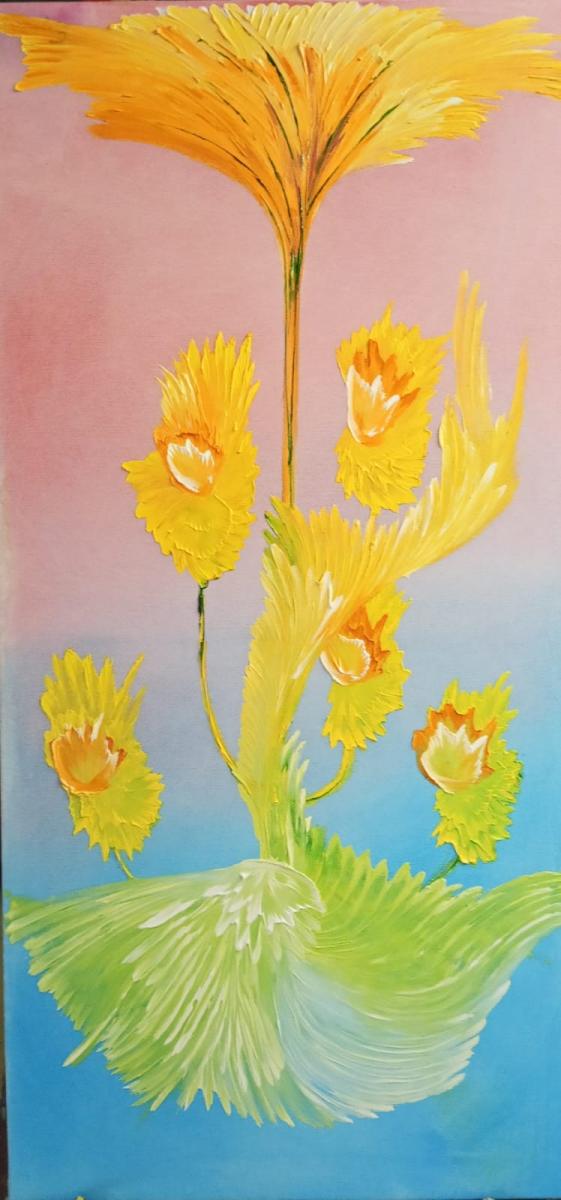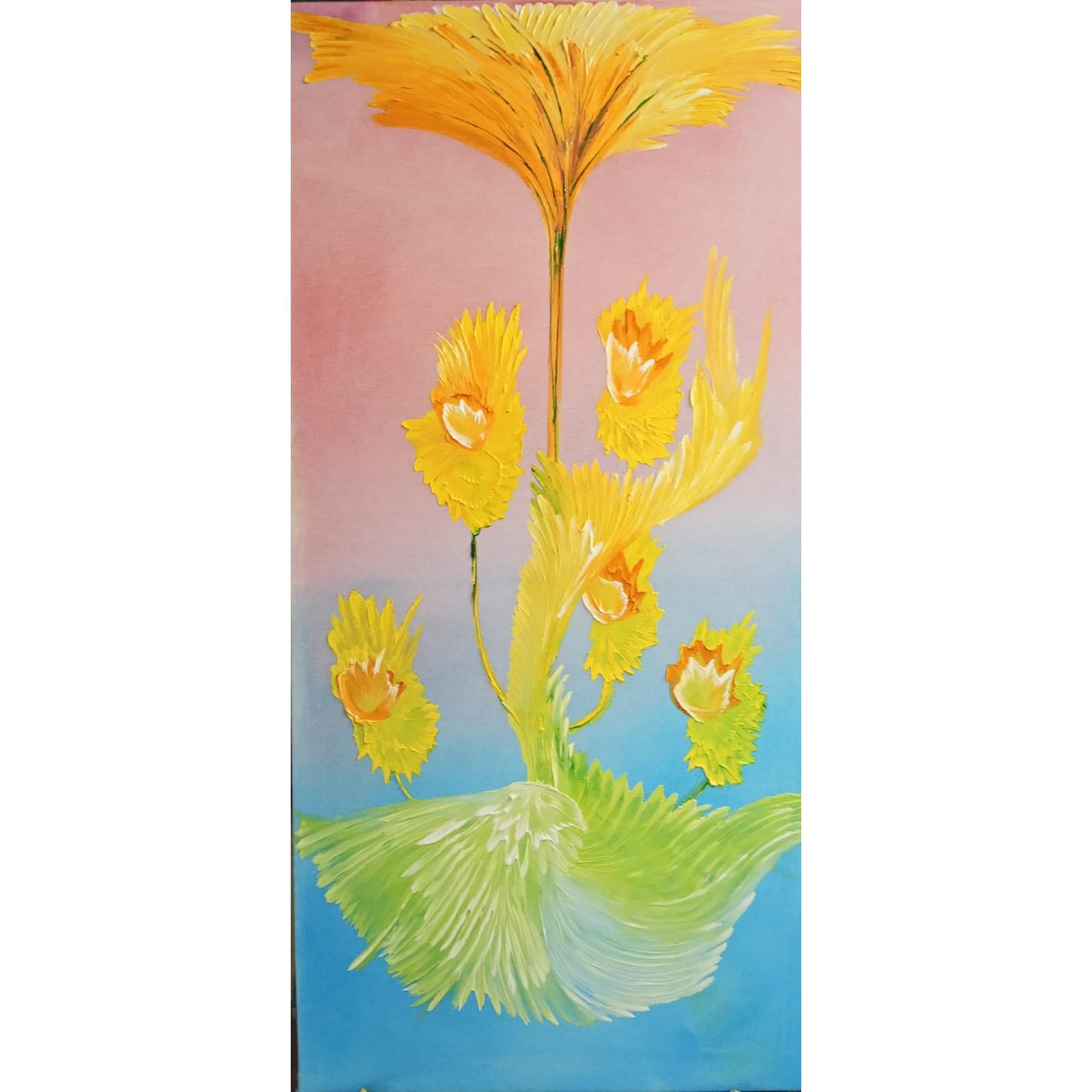 Dal fondo luminoso emergono forme floreali che si aprono verso l’alto, come se la luce stessa prendesse vita e iniziasse a fiorire. I gialli intensi dialogano con il bianco e con il respiro dell’azzurro e del rosa, creando un movimento verticale che accompagna lo sguardo verso l’alto.