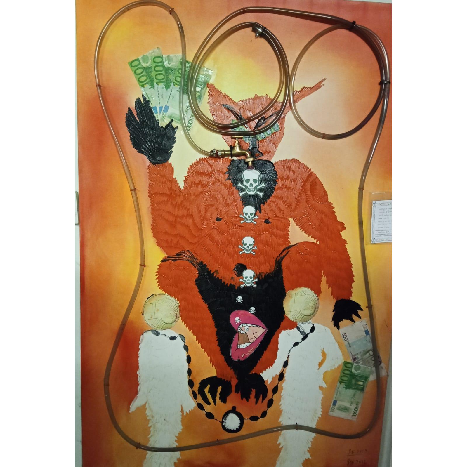 Autore: Gigì (Luisa Borin)DESCRIZIONE DELL'OPERA E NOTA CRITICA:"Quest’opera non è una semplice pittura, è un reperto di resistenza. Al centro della tela domina un’entità demoniaca, simbolo dell’avidità industriale, realizzata con una tecnica a olio spatolato materico che dona corpo e ferocia al rosso viscerale della figura. Attorno a questo demone, ho inserito elementi reali della nostra corruzione: banconote e carta, icone di quel denaro che ha comprato silenzi e falsificato perizie, mentre il popolo di Merlara viveva ignaro nell'ombra.L'elemento centrale, il cuore del delitto, è il tubo di gomma che attraversa la composizione. Al suo interno è sigillata l’acqua del fiume Fratta, prelevata a cento metri da casa mia. Quell'acqua, che scorreva rossa e maleodorante sotto i nostri occhi, è stata imprigionata nel quadro come prova fisica di un disastro ambientale senza precedenti: l'inquinamento da PFAS. Il rubinetto è stato sigillato con ceralacca e porta impresso il mio timbro personale, a garanzia della verità che ho custodito.L'ho creata quando chi doveva proteggerci firmava 'l'ok' per laute mance, barattando la salute dei miei figli e dei miei nipoti con carriere e privilegi lontani. Mi dicevano che 'tutto andava bene', ma il Karma non mente: oggi chi ha tradito la terra ha perso l'onore, mentre questa tela resta a gridare la verità.'Non mollare mai' è il messaggio che lascio impresso: dedico questo urlo materico agli Eroi Invisibili, alla mia famiglia e alla mia gente, perché il tempo delle ombre è finito e la giustizia, come l'acqua del mio fiume, ha finalmente rotto gli argini del silenzio."