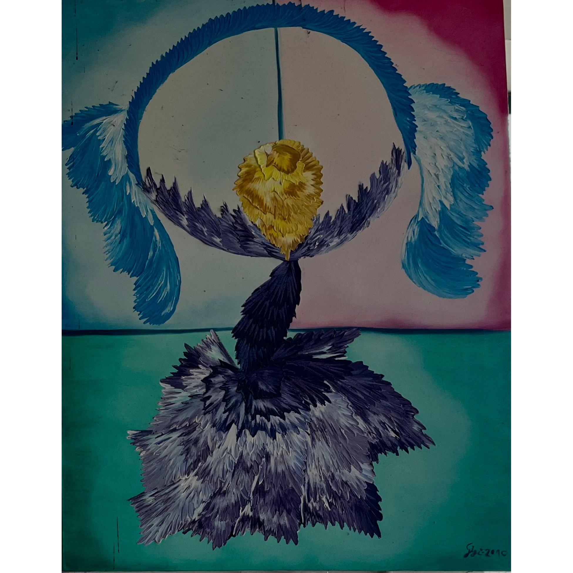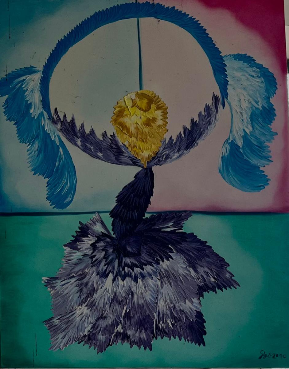 Questa opera rappresenta il mio cielo interiore, non quello che si vede ma quello che si sente. Il cerchio racchiude uno spazio che mi appartiene, un luogo protetto dove tutto trova equilibrio. Il blu è profondità, è silenzio, è ascolto. Al centro una luce gialla, presente ma custodita, come qualcosa di prezioso che non ha bisogno di gridare per esistere. Sotto, la parte più scura richiama le radici, il vissuto, ciò che mi ha portata fino a qui. Così è il mio cielo: non immenso e disperso, ma raccolto, intimo, mio. È il luogo dove ritrovo me stessa.