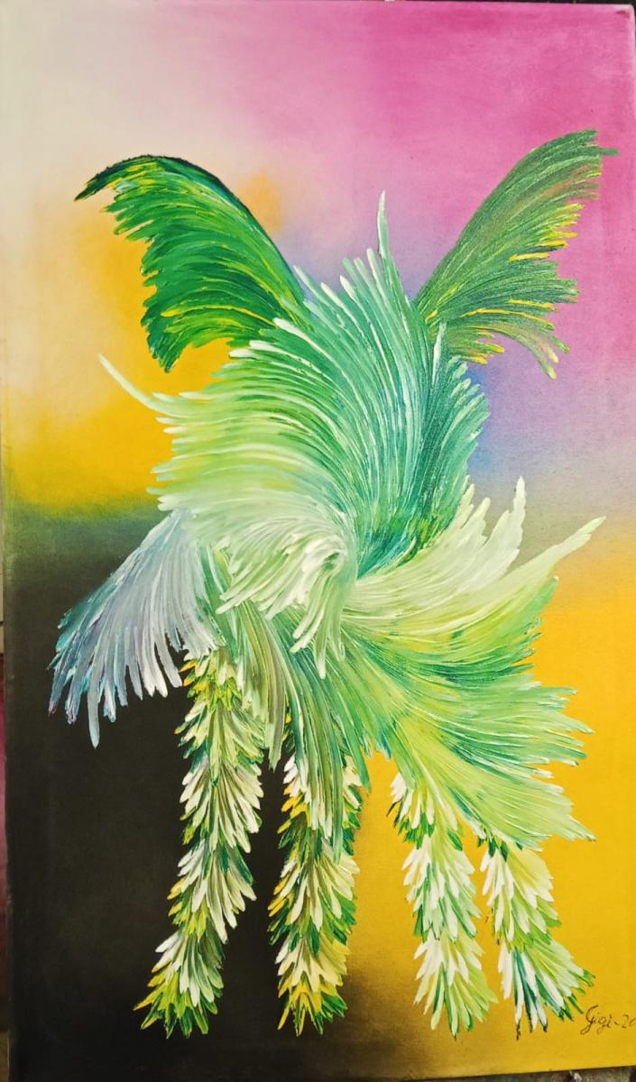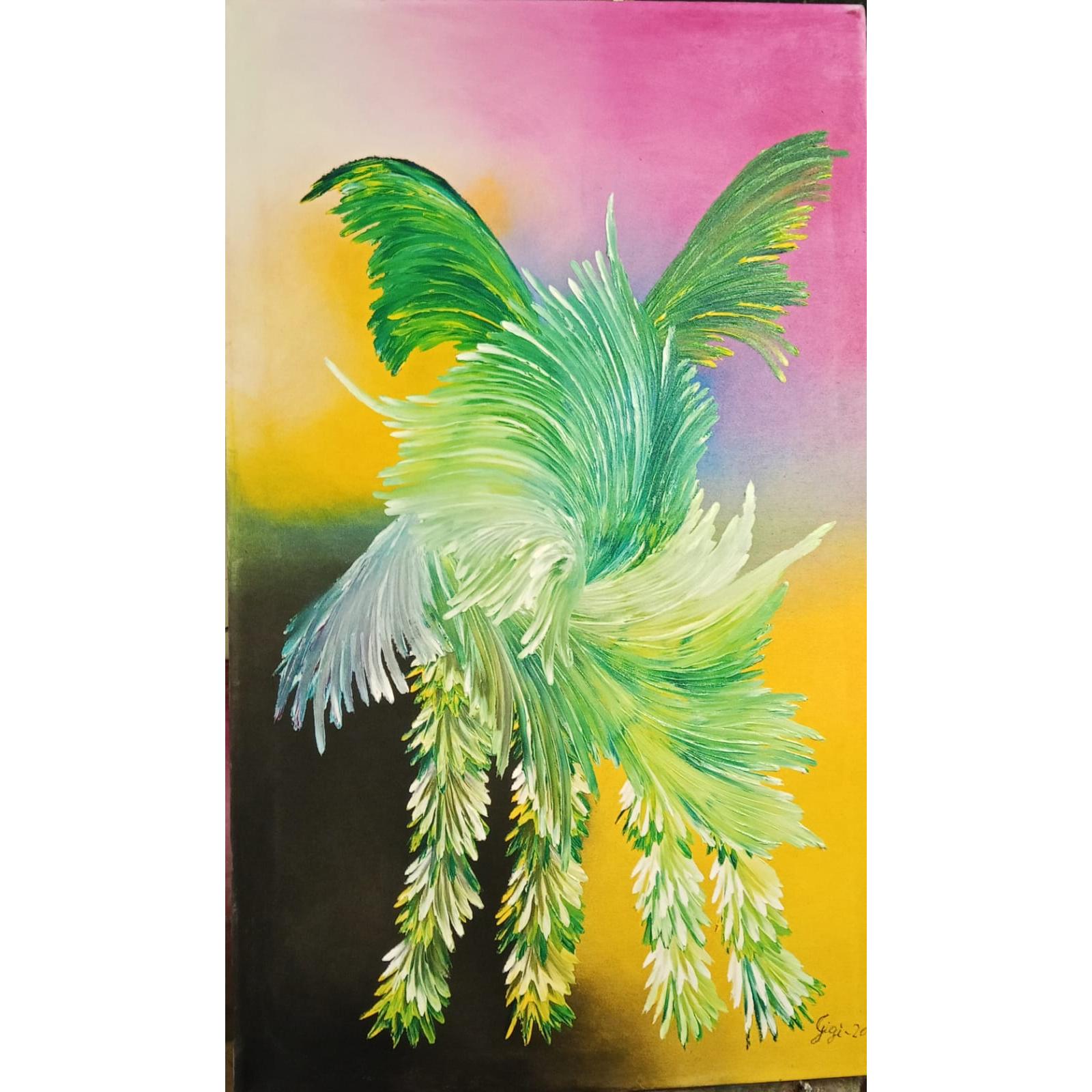 L’oltre invisibile: vibrazioni di volo tra due mondi nasce da un momento profondo del mio sentire, dove per la prima volta ho accolto anche il nero, colore che non avevo mai utilizzato, ma che la mia anima oggi ha voluto portare sulla tela. Ho lasciato che fossero le vibrazioni interiori a guidare il gesto, affidandomi completamente ai colori, alla spatola e all’ascolto di ciò che emergeva senza controllo. Il giallo rappresenta la luce che continua a esistere, il blu e il bianco si fondono generando movimento e respiro, mentre il nero diventa presenza, radice, passaggio necessario tra due dimensioni. In quest’opera non ho voluto rappresentare una figura, ma un’energia in trasformazione, un volo che attraversa ciò che si vede e ciò che non si vede. È il passaggio tra due mondi, tra ciò che siamo e ciò che stiamo diventando. Io non dipingo per spiegare, ma per sentire, e in questo lavoro ho sentito chiaramente che anche nell’ombra esiste una forma di luce.