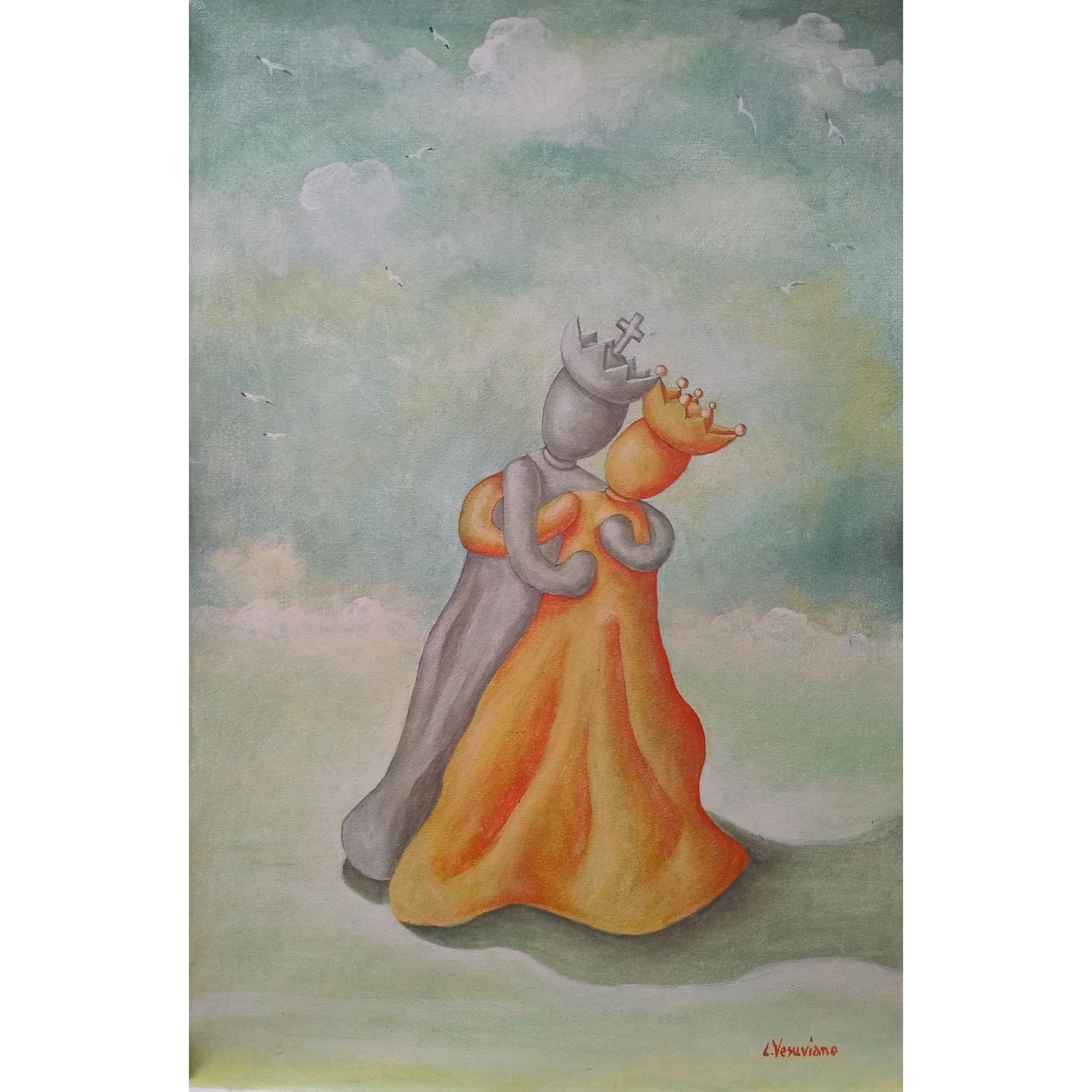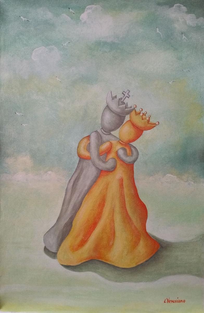 Questo dipinto fa parte di una collezione a tema scacchistico , rappresenta il ballo tra re e regina avversari sulla scacchiera ed amici sulla tela