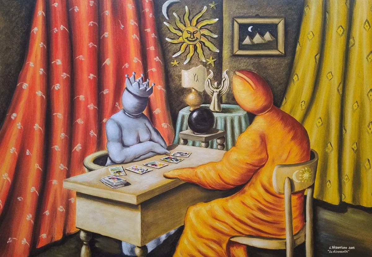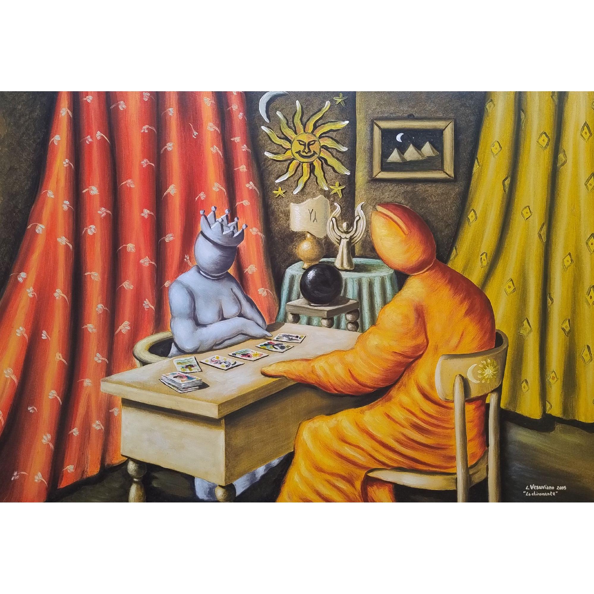 Dipinto ad olio a tema scacchistico , in questa scena la Regina legge i tarocchi ad un Alfiere che fissa le carte