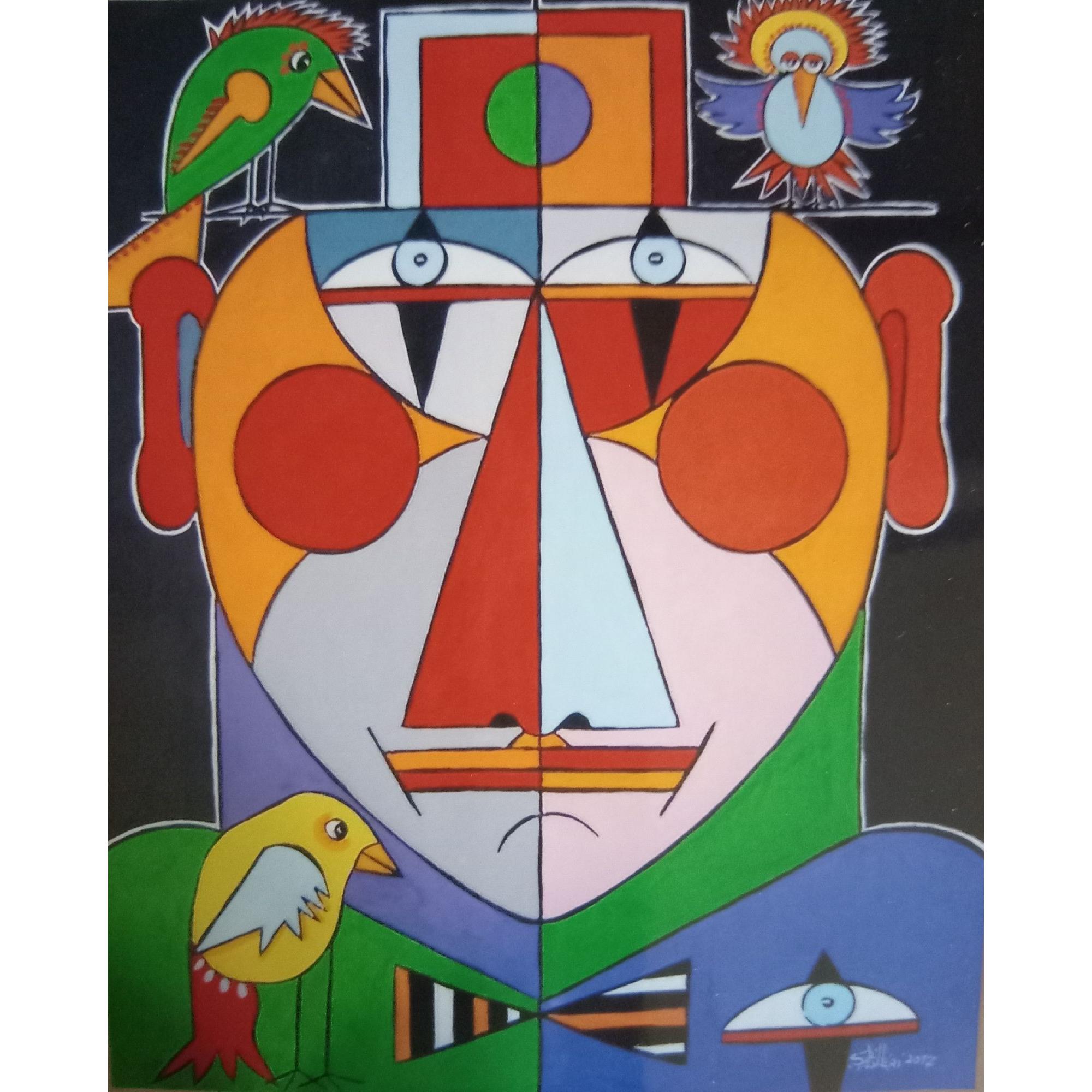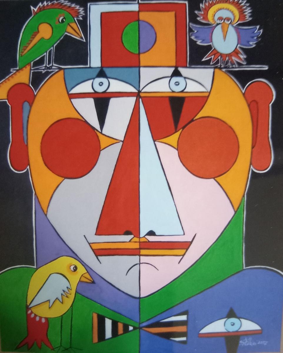 Figura fantastica di Clown in forme strettamente geometriche e colori molto vivi e accesi.