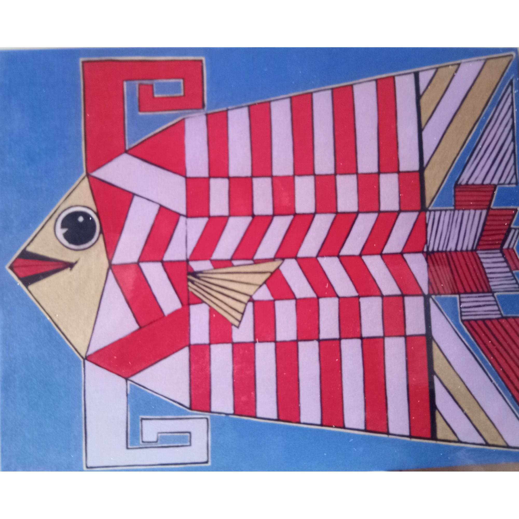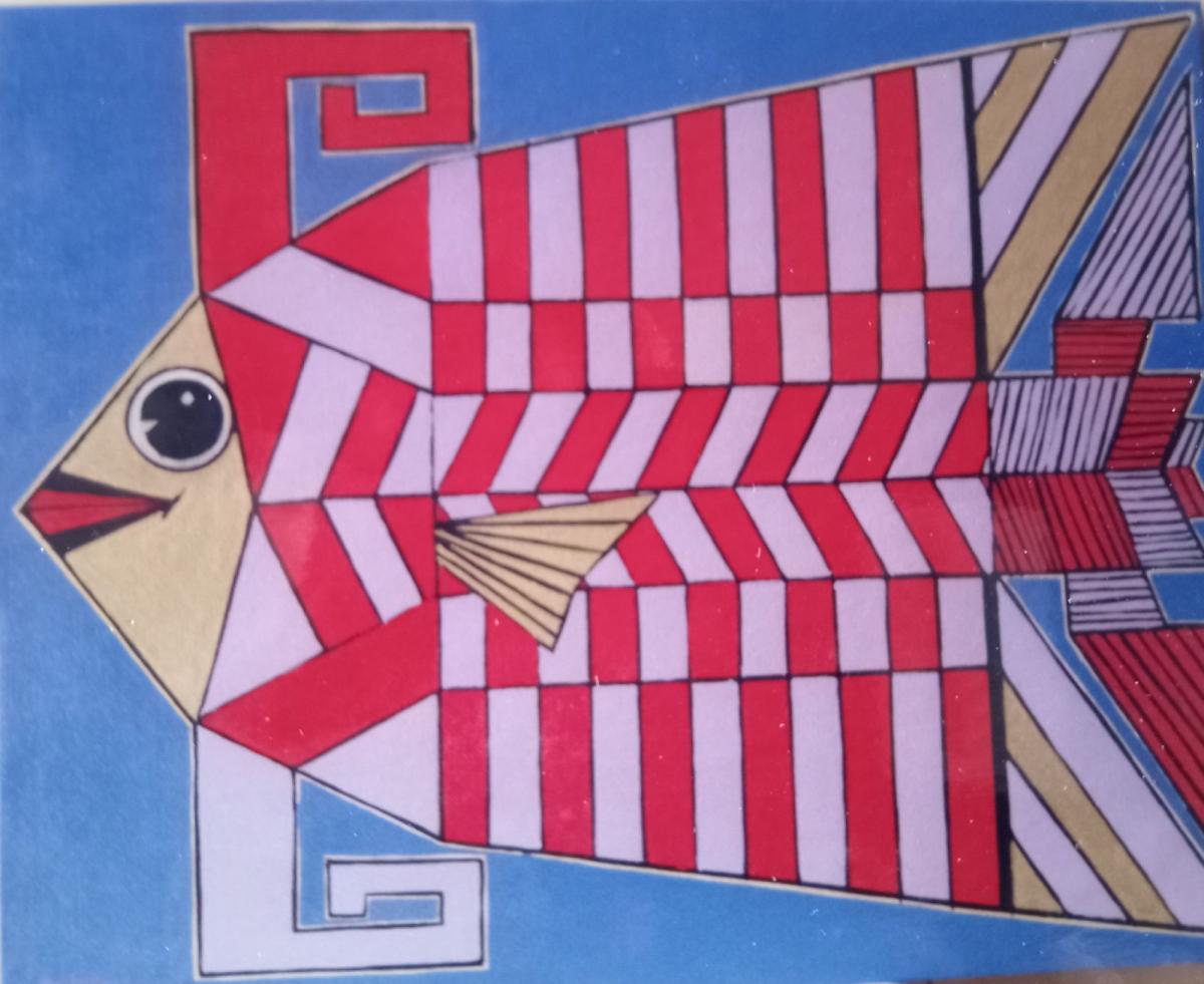 Pesce di fantasia con stilizzazione geometrica e colori intensi e vivi.