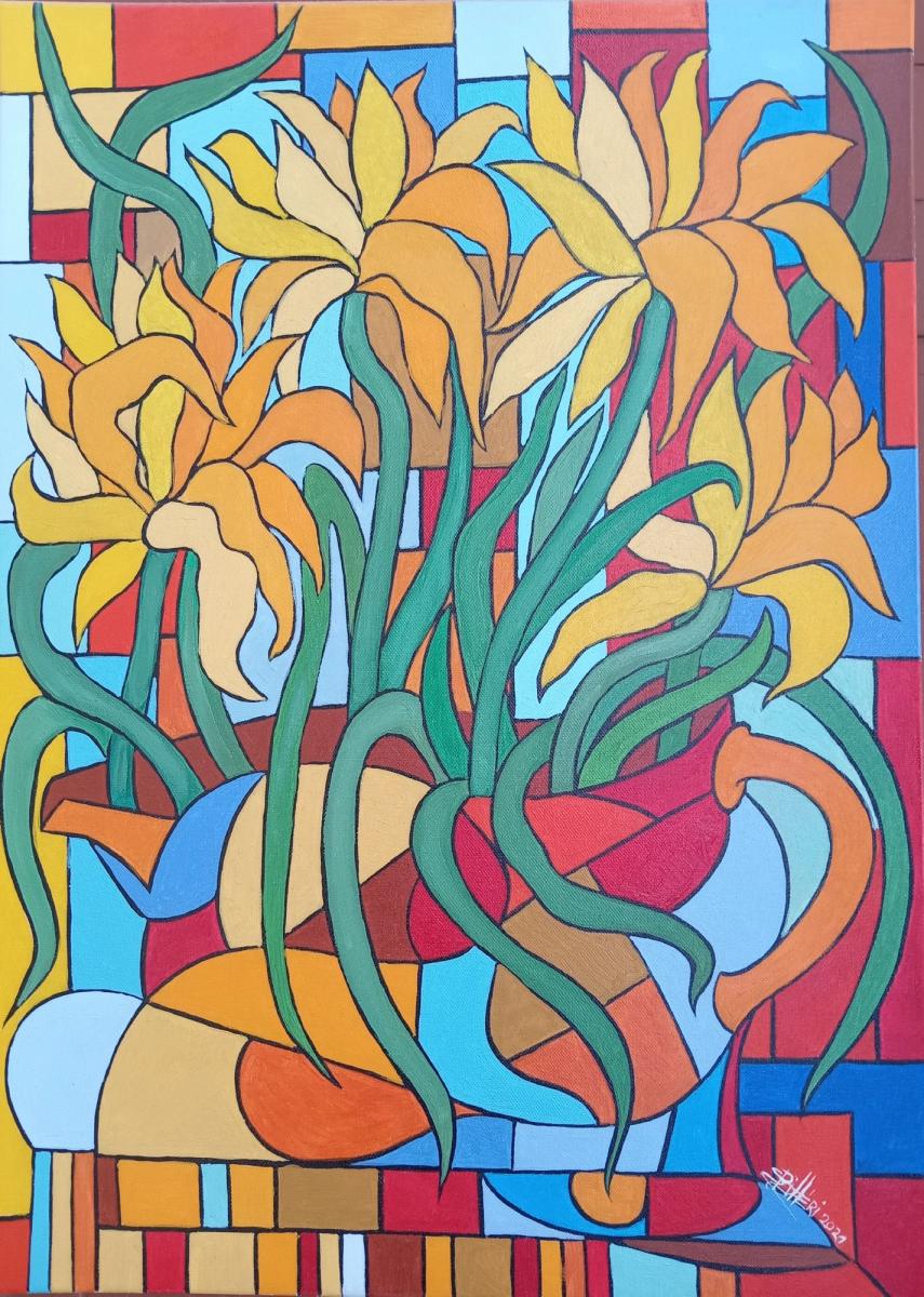 Composizione floreale che si rifa' al cubismo ed anche in un certo senso all'espressionismo. Caratterizzata da forme scomposte in piani ben delineato di colori vivi e luminosi.