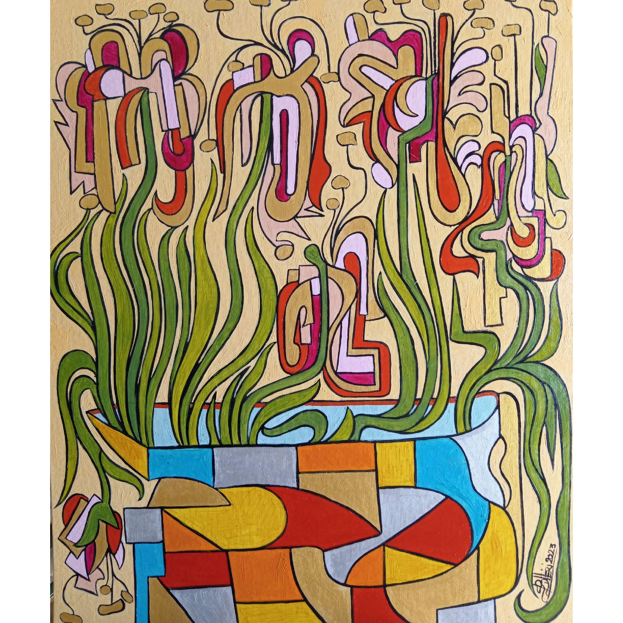 Composizione di fantasia di un vaso di fiori, ove i colori vivi e il disegno fantastico del tutto sono la caratteristica dell'opera.