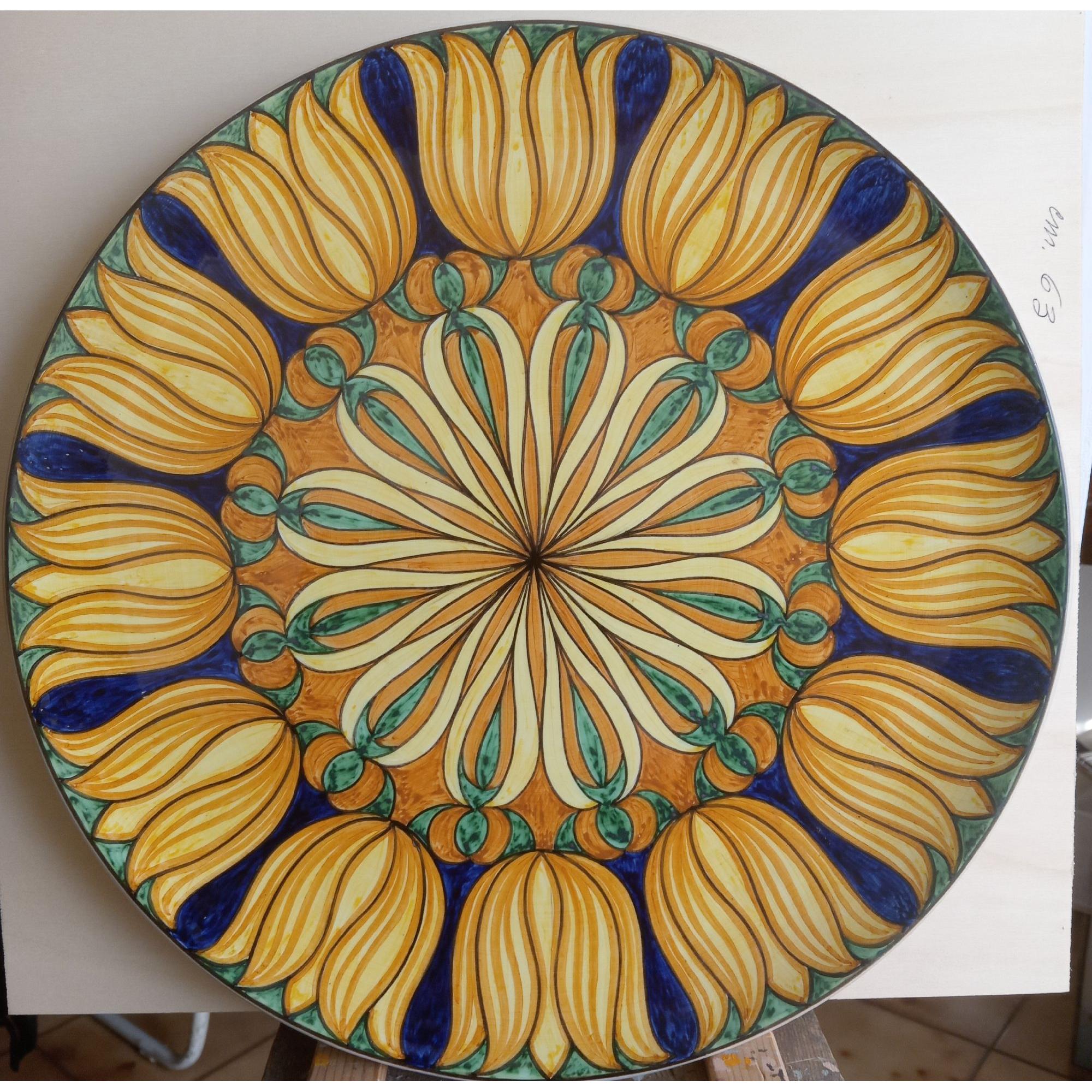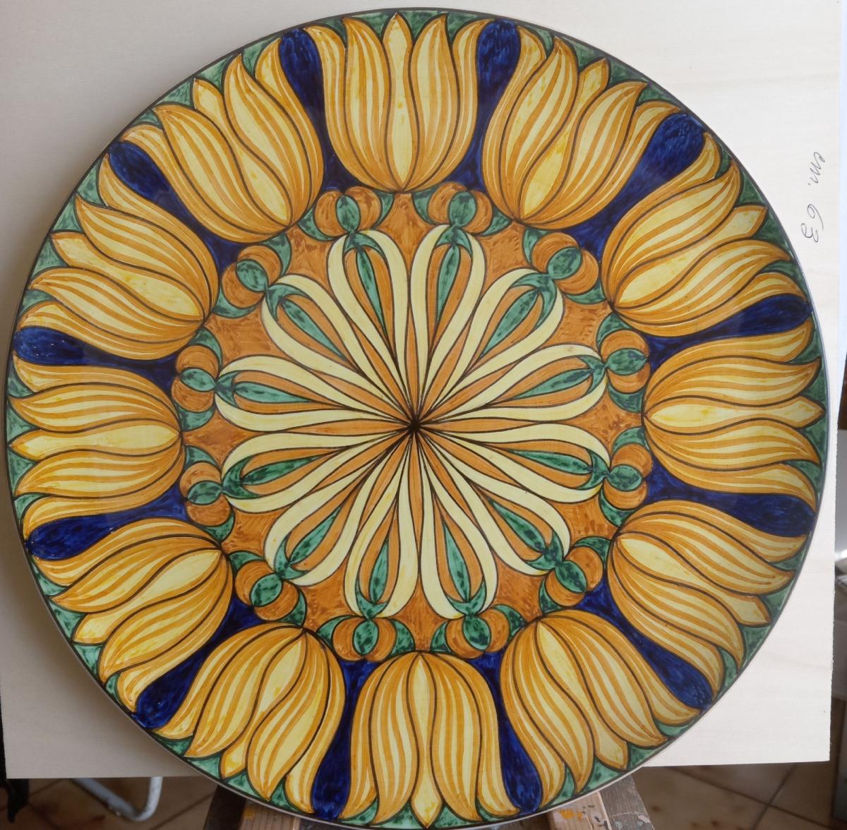 Piatto in terra bianca dipinto in stile geometrico floreale liberty e invetriato con cristallina cotto a 920°. Decoro in giallo e arancio su fondo Bleu e verde, con tornatura in Bruno.Puo' essere venduto in coppia con l'altro simile pubblicato IT266.