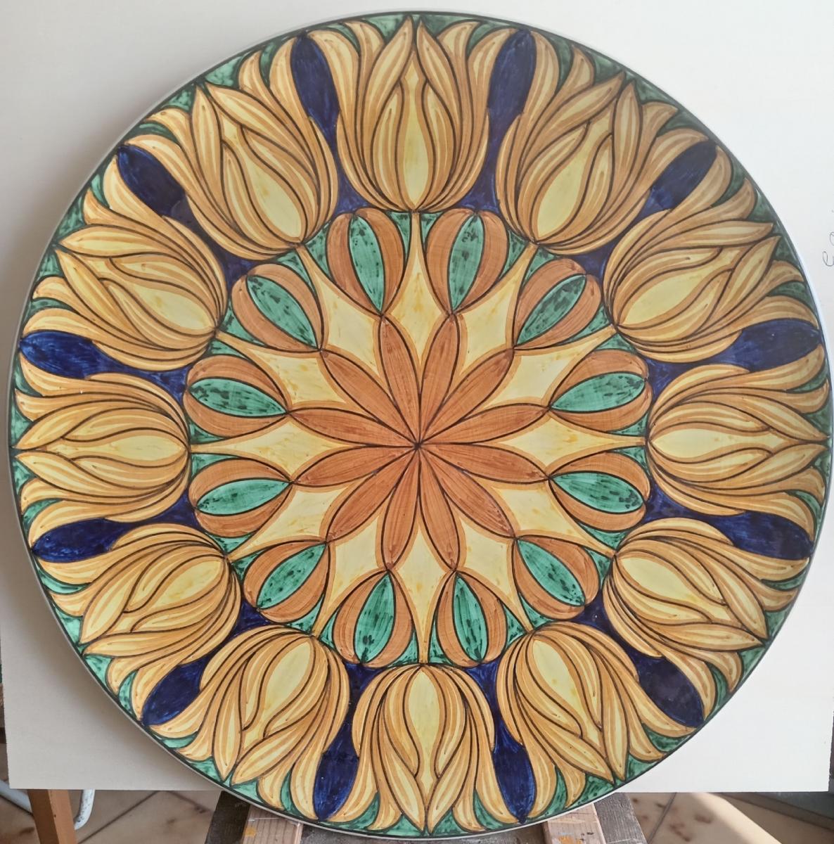 Piatto in maiolica bianca decorato con Composizione floreale geometrica liberty, dipinto in colori giallo arancio su fondo verde e blu,con con tornitura in bruno,invetriato con cristallina e cotto ad una temperatura di 920°. Puo' fare coppia col piatto precedentemente pubblicato col numero IT265.