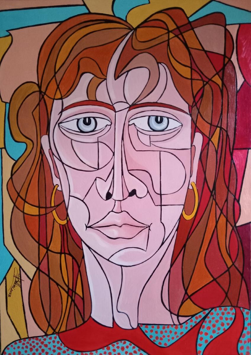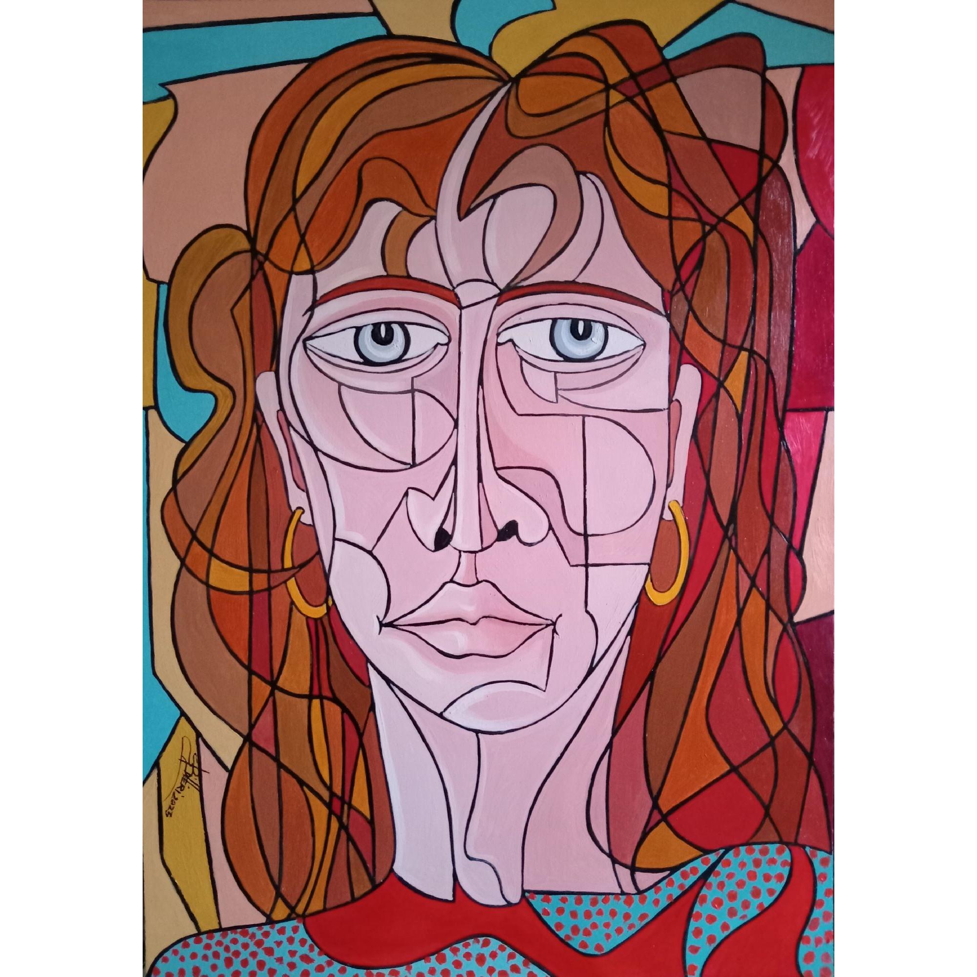 Ritratto di ragazza di connotazione espressionistica eseguita ad olio su supporto di compensato.Con colori vivaci con scomposizione di forme.