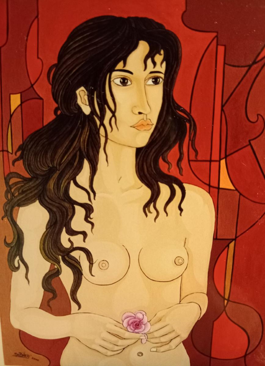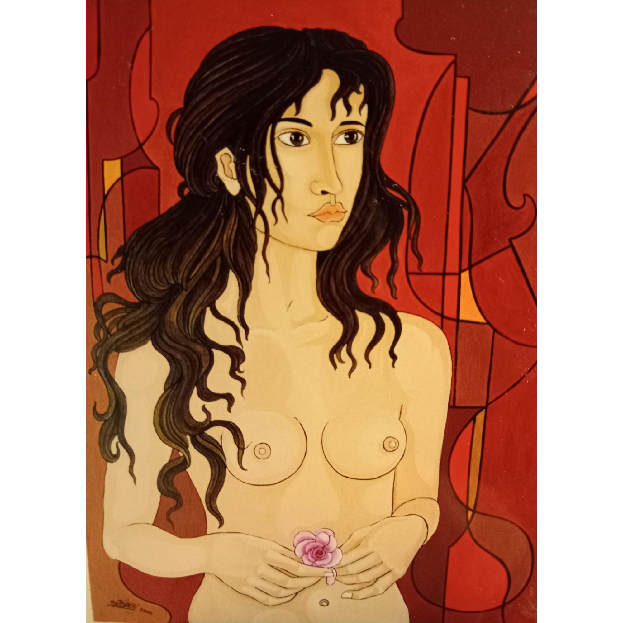 Nudo tra il reallta' e fantasia su fondo geometrico dove predominant tonalita' d rosso.