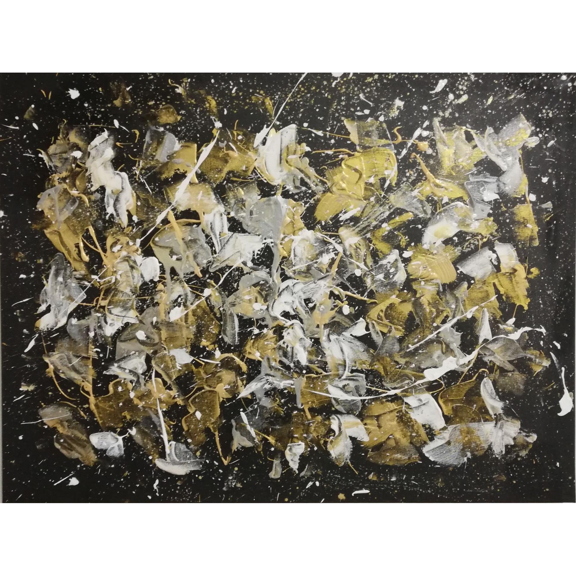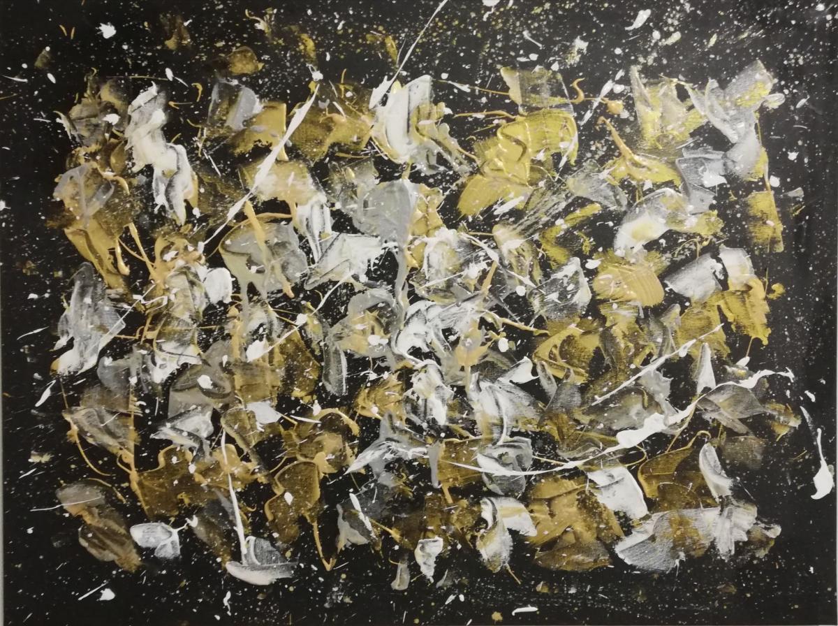 SI TRATTA DI UN’OPERA ARTIGIANALE PRODOTTA IN UNICO ESEMPLAREREALIZZATA SU TELA CON SFONDO NERO RAVVIVATA DA UNA SERIE DI PASSAGGI DI COLORIORO ARGENTO E BIANCO IMPRESSI IN MANIERA INCONTROLLATA CON SPATOLA