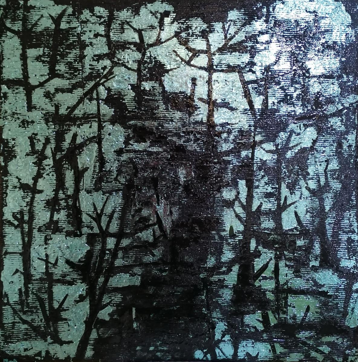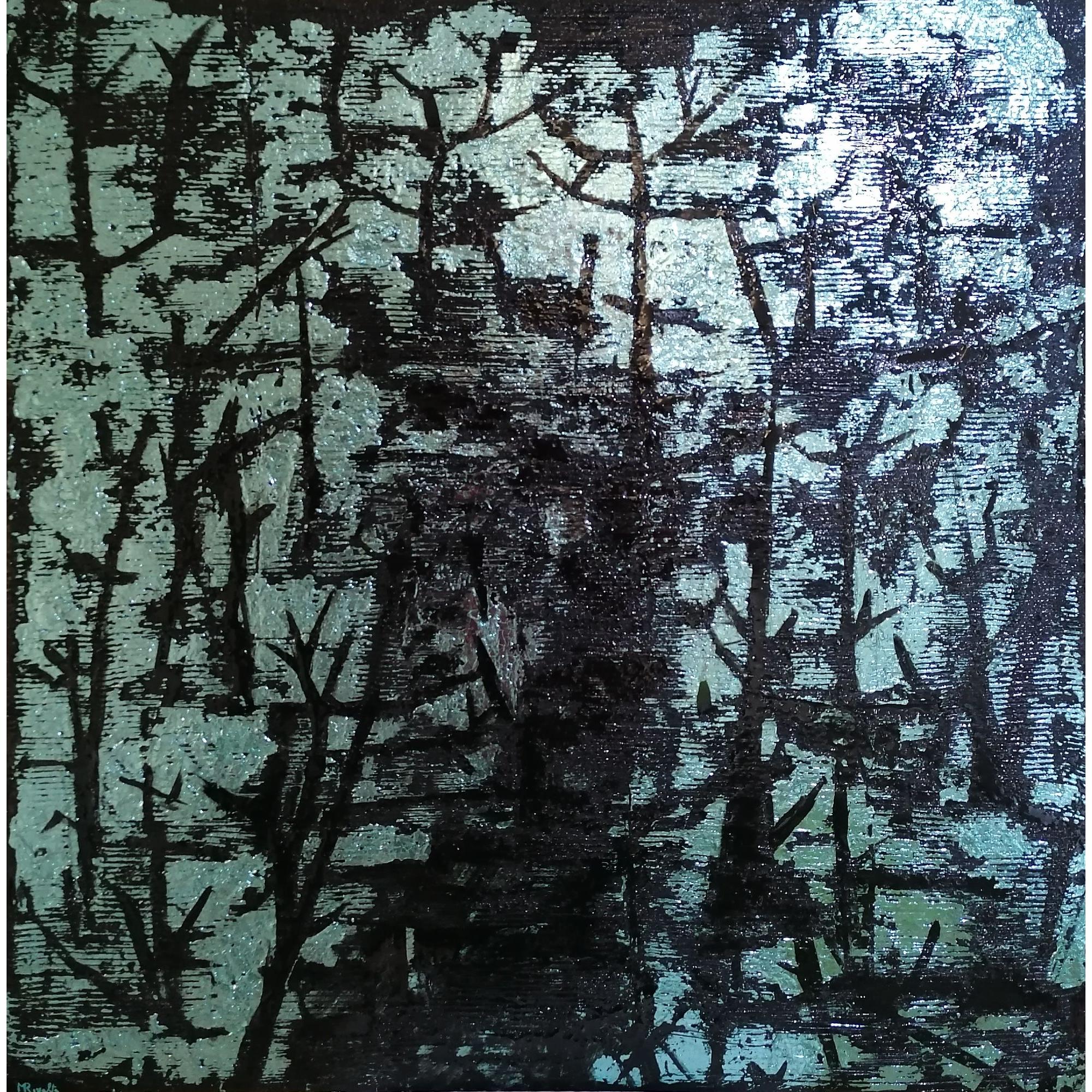 Titolo: Bosco ghiacciato, Giralba. Autore: Massimo Rivalta. Gennaio 2025. Tecnica mista. Calce idrata, marmo, resina acrilica, vernice acrilica, resina epossidica, smalto per ceramica.Opera su tela gallery. Dimensioni 100 x 100 cm.Appendere con tassello a muro. Instagram @rivalta.massimo BOSCO GHIACCIATO, GIRALBA "Bosco ghiacciato, Giralba" evoca immediatamente un'atmosfera particolare, quasi sospesa nel tempo.L'opera si presenta su una tela gallery, suggerendo una tridimensionalità intrinseca data anche dall'uso abbondante di materiali. Il fondo è decisamente materico, caratterizzato da un andamento rigato, interrotto da rotture e poi "suturato", creando una superficie irregolare e con una forte texture tattile, accentuata dal nero carbone dominante. Su questo sfondo scuro emergono elementi colorati realizzati con smalto per ceramica, che donano un effetto cangiante nelle tonalità del verde, verde acqua e argento, richiamando la sensazione del ghiaccio.L'utilizzo della resina epossidica trasparente in vari spessori contribuisce a creare profondità e lucentezza, quasi a simulare la superficie scivolosa e riflettente del ghiaccio. All'interno di questo paesaggio materico si distinguono forme che suggeriscono alberi, forse abeti o larici stilizzati, con le loro ramificazioni scure che si stagliano sul fondo più chiaro. Si intravede anche la possibilità di un sentiero o forse un bivio, suggerito da linee che si insinuano tra gli alberi. Nonostante la prevalenza di colori freddi, si percepisce un "calore" sottile, forse emanato dalla luminosità argentea o dalla vitalità intrinseca degli elementi naturali rappresentati.La forza di quest'opera risiede nella sua matericità e nella stratificazione dei diversi elementi. La composizione non segue canoni tradizionali di prospettiva, ma si concentra piuttosto sulla resa di una sensazione, di un'atmosfera. L'artista sembra utilizzare la morfologia degli elementi naturali – le linee verticali degli alberi, le increspature del fondo che ricordano la neve o il ghiaccio – per costruire un paesaggio interiore più che una rappresentazione fedele di Giralba.La giustapposizione tra la ruvidità del fondo nero carbone e la lucentezza smaltata degli elementi colorati crea un interessante dialogo visivo e tattile. Le "rotture" e le "suture" nel fondo materico potrebbero essere interpretate come le cicatrici del paesaggio invernale, le fessure nel ghiaccio o i segni lasciati dal tempo e dagli agenti atmosferici. L'uso della resina epossidica non solo aggiunge un livello fisico all'opera, ma contribuisce anche a "congelare" il momento, a rendere palpabile la sensazione del ghiaccio.La presenza degli alberi stilizzati, quasi delle grafiche incise, aggiunge un elemento figurativo riconoscibile, ancorando l'opera al tema del bosco. La potenziale presenza di un sentiero o di un bivio introduce un elemento narrativo, suggerendo un percorso o una scelta all'interno di questo ambiente ghiacciato."Bosco ghiacciato, Giralba" va oltre la semplice rappresentazione di un luogo. L'opera sembra esplorare la dualità tra la rigidità e la staticità del ghiaccio e la vitalità persistente della natura, simboleggiata dagli alberi. I colori freddi dominanti potrebbero evocare sentimenti di isolamento, silenzio e la quiete tipica dei paesaggi invernali. Tuttavia, l'accenno di "calore" percepito potrebbe suggerire una resilienza nascosta, una scintilla di vita che pulsa anche sotto la superficie gelida.Il fondo materico, con le sue imperfezioni e "suture", potrebbe metaforicamente rappresentare la fragilità e la forza della natura, la sua capacità di essere ferita ma anche di rigenerarsi. L'utilizzo di materiali non tradizionali come lo smalto per ceramica e la resina epossidica conferisce all'opera un carattere contemporaneo, spingendo i confini della pittura e della scultura.L'opera invita lo spettatore a immergersi in un paesaggio che è al contempo familiare e alienante, un luogo dove la bellezza austera del ghiaccio convive con la tenacia della vita vegetale. Il sentiero o il bivio diventano allora simboli di scelte e percorsi esistenziali all'interno di questo scenario immobile ma vibrante di energia latente.In conclusione, "Bosco ghiacciato, Giralba" è un'opera che stimola i sensi e la riflessione. Attraverso la sua ricca matericità, la sua composizione evocativa e l'uso inatteso dei materiali, l'artista riesce a trasmettere non solo l'immagine di un luogo, ma soprattutto un'esperienza emotiva e concettuale complessa e affascinante.