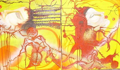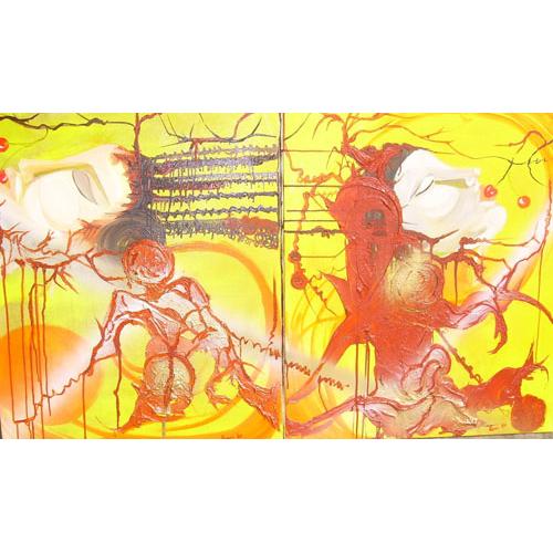 Quest’opera doppia, “Insieme diventa Condivisione di sapore A in B”, è una dichiarazione potente sullo scambio profondo tra due identità, due presenze, due sensibilità. Le due tele si specchiano e si nutrono a vicenda, con un linguaggio visivo che oscilla tra l’intimo e il simbolico.