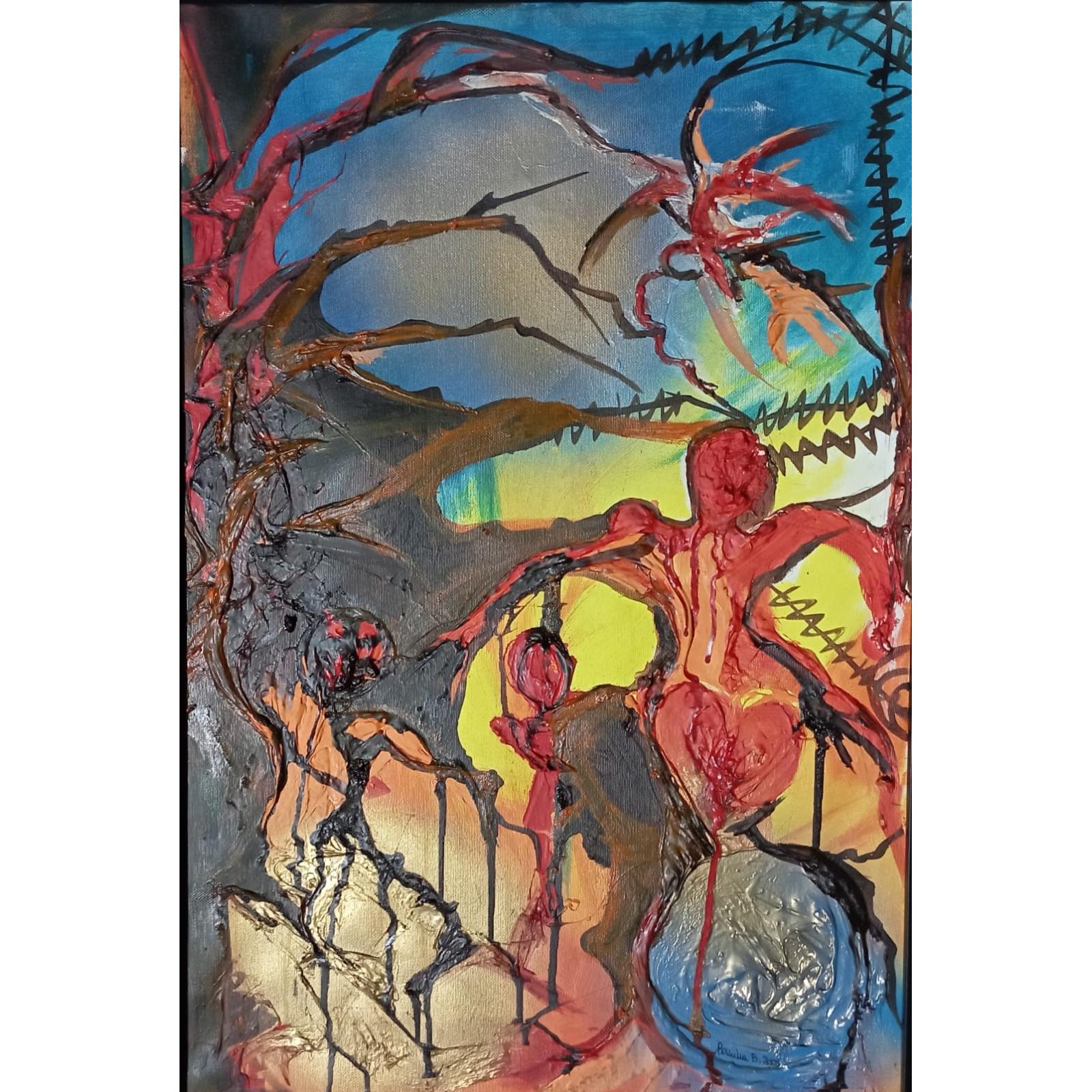 Le figure che emergono sono distorte, viscere dell’anima,sospese tra dolore e rinascita. Ho usato materiali diversi per rendere più vivoquel groviglio interiore, quel nodo profondo che mi accompagna e che spessoguida le mie scelte senza che me ne accorga.