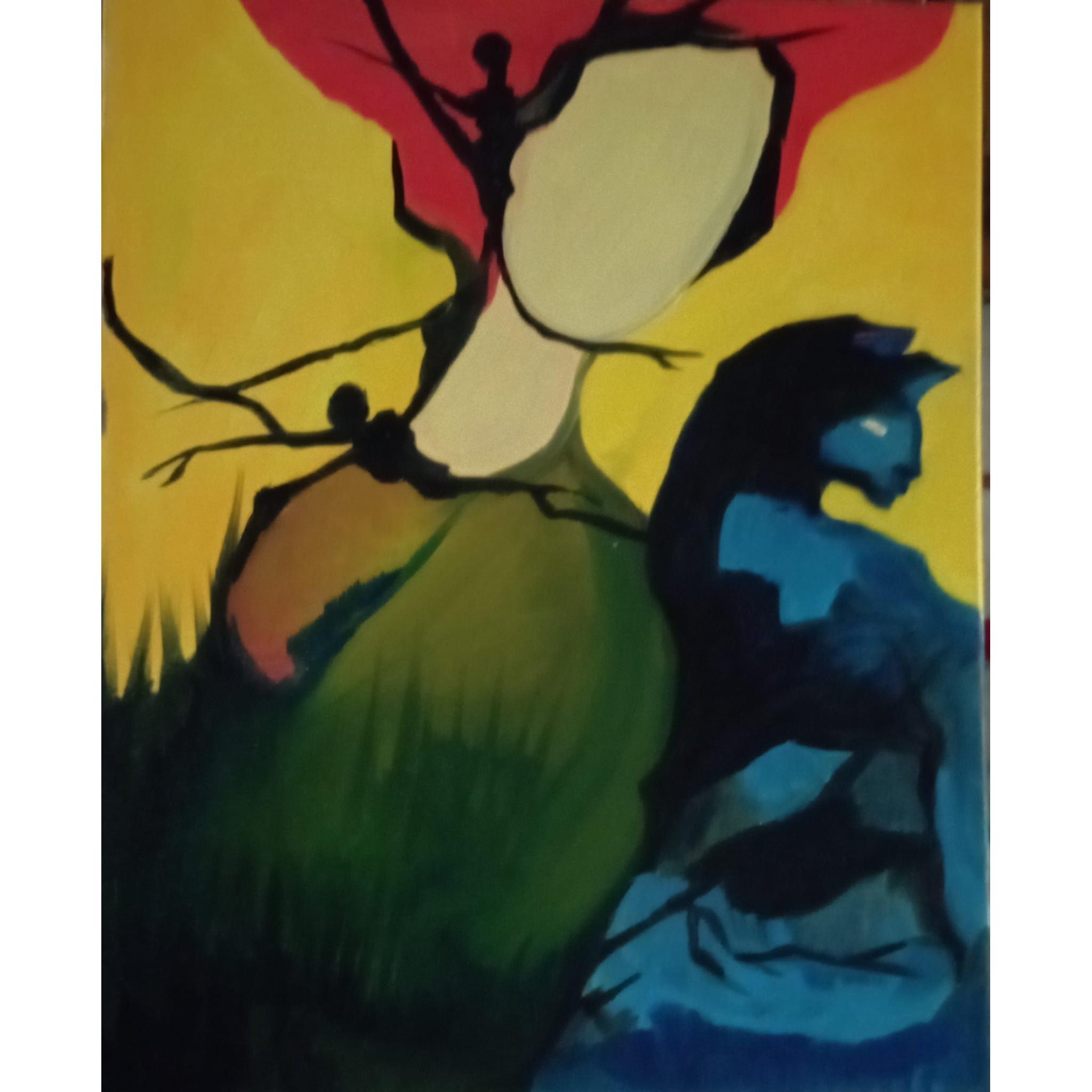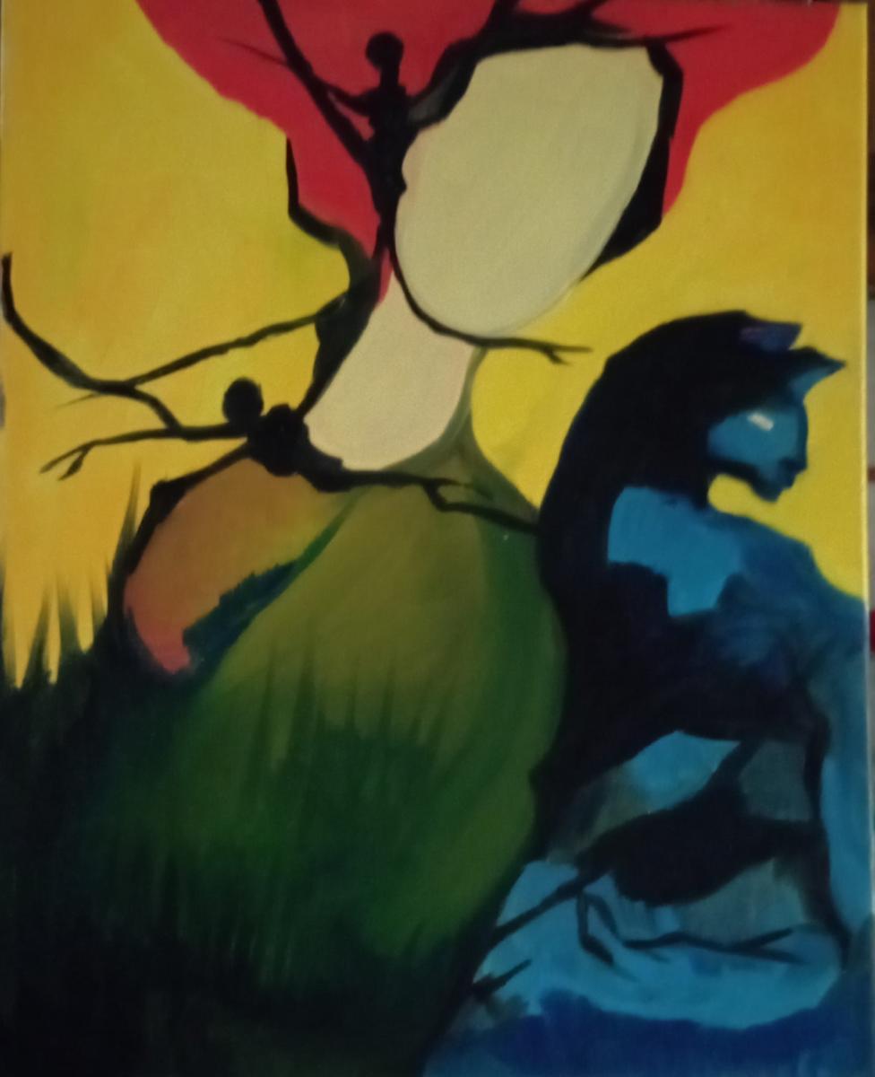In quest'opera, voglio esplorare il tema della dissoluzionedell’identità attraverso forme fluide e simboliche. La figura centrale, privadi volto, diventa un contenitore di tensioni interiori: rami neri si estendonocome membra distorte, evocando memorie, pensieri, o forse presenze invisibiliche ci abitano.