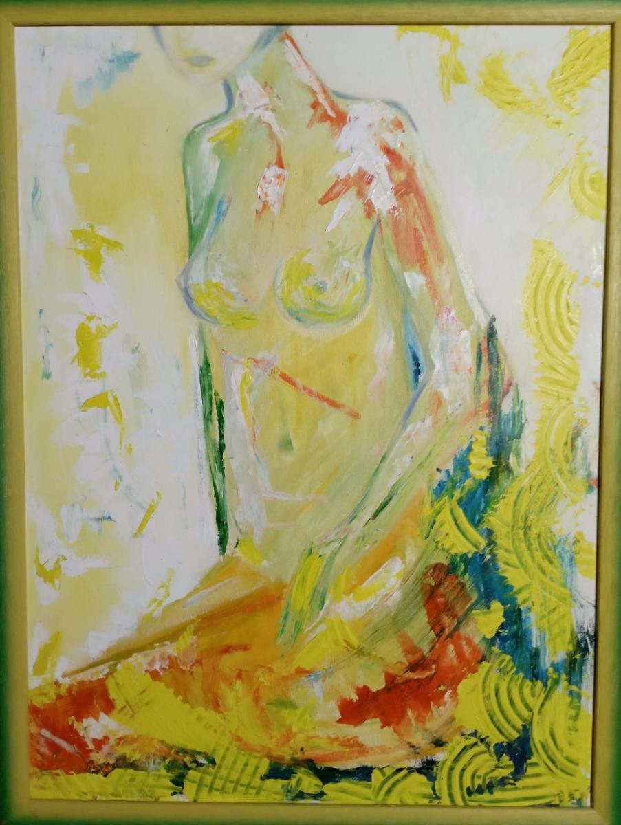 L’ho dipinta lasciandomi guidare dalla luce e dal calore deicolori, che si mescolano sulla pelle come emozioni vive, in trasformazione. Ilcorpo non ha volto: è un simbolo universale, un luogo di vita, di bellezzanaturale e vulnerabilità. I tratti morbidi e le texture a rilievo voglionoevocare la forza che nasce proprio dalla dolcezza.