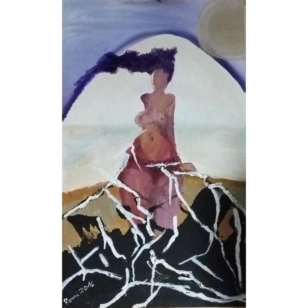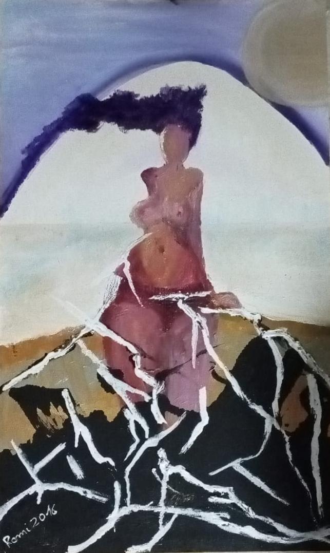 La figura femminile, al centro della composizione, emergecome un totem arcaico, una presenza sospesa tra la terra e il cielo. Lacorporeità è suggerita, non dettagliata, come a evocare una maternitàprimordiale, un’origine. Il contrasto tra i colori caldi del corpo e lafrattura scura sottostante, attraversata da linee bianche simili a crepe,rafforza l’idea di un’energia che si genera proprio nella tensione fra luce eombra.