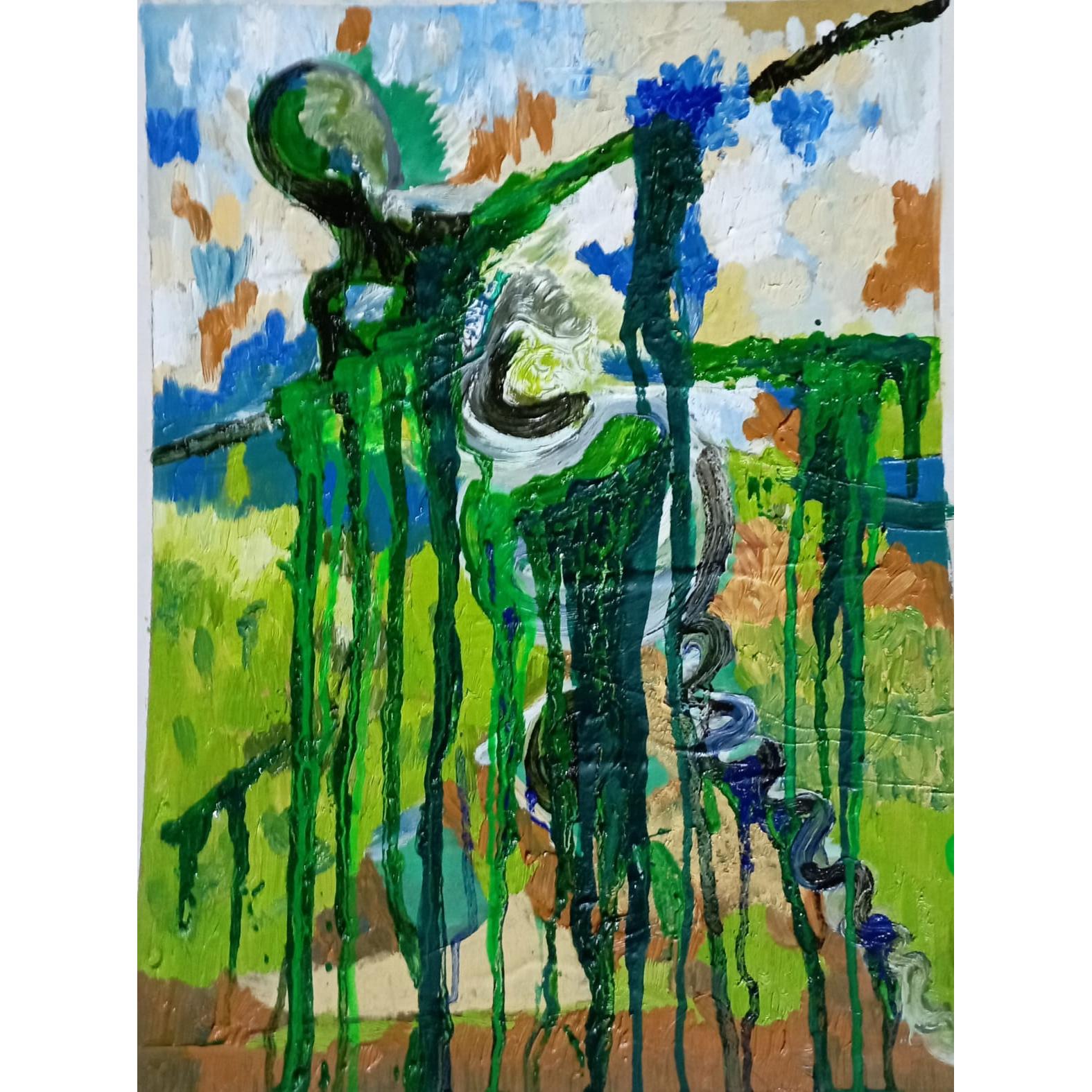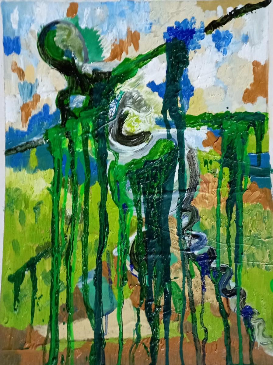 Quest’opera è intensa e carica di significato, sia nel gestopittorico che nella materia. Il titolo “Clessidra dal positivo al negativo –Sars-19” suggerisce una riflessione sul tempo, sul passaggio e sullatrasformazione, legata a un evento collettivo traumatico come la pandemia. Lafigura centrale sembra in bilico, sospesa o forse travolta da colature verdi,simbolo possibile di decadimento, contaminazione o mutamento biologico/sociale.Il verde, solitamente associato alla vita, qui prende una forma ambigua,vischiosa, quasi tossica.