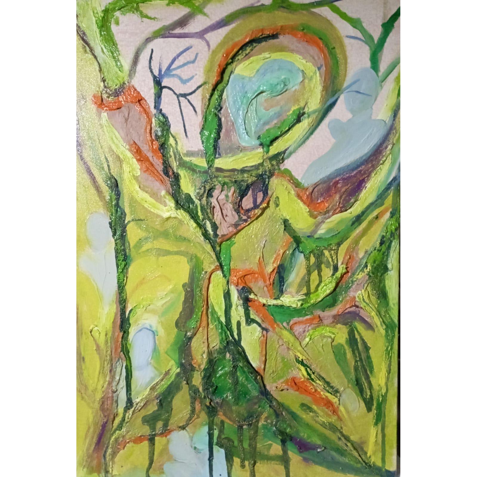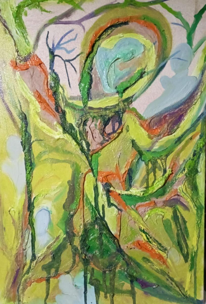 C’è un occhio che veglia, che osserva senza giudicare masenza distrarsi. È presenza, è coscienza, è forse anche memoria. Intorno, tuttoscorre e si deforma: radici, corpi, rami, come se la natura e l’essere umanofossero la stessa cosa. Il verde domina, ma non è quiete: è crescita, è lotta,è linfa che scorre anche quando sembra colare via. E proprio da questecolature, da queste ferite aperte, qualcosa nasce sempre.
