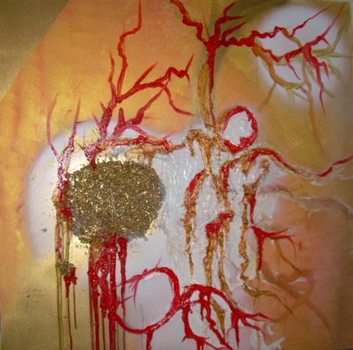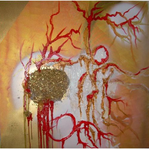 Sono io. Spaccata in due. Metà sogno bianco, metà incuborosso che cola.Il bianco è grande, è centrale, è abbagliante. È la purezza chemi hanno chiesto per anni: sii pulita, sii brava, sii senza macchia, sii senzapretese. È il colore della moglie del fruttivendolo quando sta zitta al banco.È il colore della tela prima che ci metti la vita sopra. Per 15 anni ho credutoche fosse il traguardo. Essere bianca. Essere pura. Essere senza.Il rosso èradici, è vene, è sangue che non sta fermo. Entra nel bianco e lo sporca. Lograffia. Lo apre. È la realtà che spinge da sotto. È la rabbia che ho tenutodentro mentre lucidavo limoni. È il sesso, è il dolore, è il casino che ho fattoquando ho smesso di essere solo sfondo. La purezza esclusiva non esiste: appenavivi, ti macchi.L’oro a sinistra è pesante, è materia, è un sole malato. È ilsogno. È quello che luccica da lontano quando sei nel cotone, quando seilontana, quando sei macchia. Se resisti, poi arriva l’oro. Ma l’oro nonillumina. Pesa. È colloso. È il compenso che ti danno quando hai già dato viatutta la vita: un po’ di lustro appiccicato addosso per farti stare buona.Leforme sono embrioni, sono organi, sono fiori marci. Sono io tra sogno e realtà:non nata del tutto, non morta del tutto. Sto in quel limbo dove non sei più laragazza che sperava e non sei ancora la donna che ha scelto. Sei solo carneaperta, con le vene esposte, che aspetta di capire da che parte andare.Ilpensiero critico è questo: la purezza è una truffa. Te la vendono come valore,ma è solo un modo per tenerti ferma. Resta pura vuol dire non ti muovere, nonti sporcare, non desiderare, non sbagliare, non vivere. Per 15 anni ho provatoa restare bianca. E intanto il rosso cresceva sotto. Spingeva. Si faceva largotra le costole.“Esclusiva” perché ti esclude. Se sei pura non sei intera. Sesei bianca non sei vera. Se non sanguini non sei viva. Io ho scelto disanguinare. Ho lasciato che il rosso entrasse, che le radici rompessero latela, che l’oro si incollasse di fianco senza comandare. Ho smesso diproteggere il bianco.Tra sogno e realtà ho scelto la macchia. Ho scelto iltaglio. Ho scelto il punto esatto dove il rosso sporca il bianco e nasce qualcosache non ha nome. Non è più sogno perché fa male. Non è più solo realtà perchéha ancora luce. È la mia vita, 15 anni dopo: impura, aperta, viva.La purezzaesclusiva era una prigione bianca.
