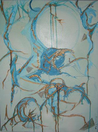 Spezzata. Filo spinato azzurro su fondo pallido. Non volo.Mi tengo insieme. Il bianco è di nuovo lì, ma non è più cancellazione come neiNuovi orizzonti. È stanchezza. È il colore che prende la carta quando la pieghie la riapri mille volte. Sono spiegazzata. Sono tutte le volte che mi sonoaperta e richiusa, che sono partita e tornata, che ho detto da domani e poi eradi nuovo oggi. L’ azzurro è nervoso, è rotto, è fatto di tratti che non siincontrano. È il mio sistema nervoso nel quotidiano. Non è il blu calmo delmare di All’orizzonte. È il blu elettrico di quando devi tenere insieme laspesa, la casa, il lavoro, i ricordi, la rabbia vecchia e la speranza nuova, eti senti un circuito che sta per saltare. Ci sono cerchi, ci sono occhi, cisono bersagli. Sono i punti che devo centrare ogni giorno: sveglia, mercato,conti, silenzio, cena, letto. Sono gli obiettivi che mi metto da sola perché senon me li do io non me li dà nessuno. Sono anche gli occhi che mi hannoguardata per anni e non mi hanno mai vista davvero. Ora li ho tatuati addosso,e mi guardo da sola. Le linee marroni sono strappi. Sono le cicatrici deiquadri di prima. È il ruggine della sintesi dell’arcobaleno che torna fuori. Èil marrone della terra quando la calpesti tutti i giorni. Il quotidiano non èvolo. È camminare sullo stesso sentiero fino a consumarlo. È rifare gli stessigesti fino a diventare il gesto. Il pensiero critico è questo: ci vendono ilvolo come evasione. Libera la mente, sogna in grande, vola alto. Poi ti sveglie devi comunque pagare le bollette. Il volo quotidiano non è planare sopra lecose. È restare sospesa dieci centimetri da terra mentre fai tutto quello chefacevi prima, solo che adesso hai i piedi che non toccano. Sei leggera persfinimento, non per grazia. Dopo la pianta di Trasmissioni di energia, dopo lafigura bianca dei Nuovi orizzonti, pensavo di essere arrivata. E invece no. Ilquotidiano ti riporta giù. Ti riframmenta. Ti costringe a tenere insieme ipezzi con il filo di ferro perché la colla è finita. Questo azzurro è filo diferro. È quello che uso per non cadere a pezzi mentre faccio finta di volare.L’ho chiamata Il volo quotidiano con ironia feroce. Perché non sto volando. Storesistendo alla gravità. Sto facendo equilibrismo sopra la mia vita normale,che è la stessa di prima ma con me cambiata dentro. Fuori è tutto uguale: glistessi gesti, gli stessi giorni, la stessa fatica. Dentro c’è una donna che havisto il rosso, il verde, il bianco, e adesso deve tornare a fare la spesa. Nonci sono ali. Ci sono nervi tesi.