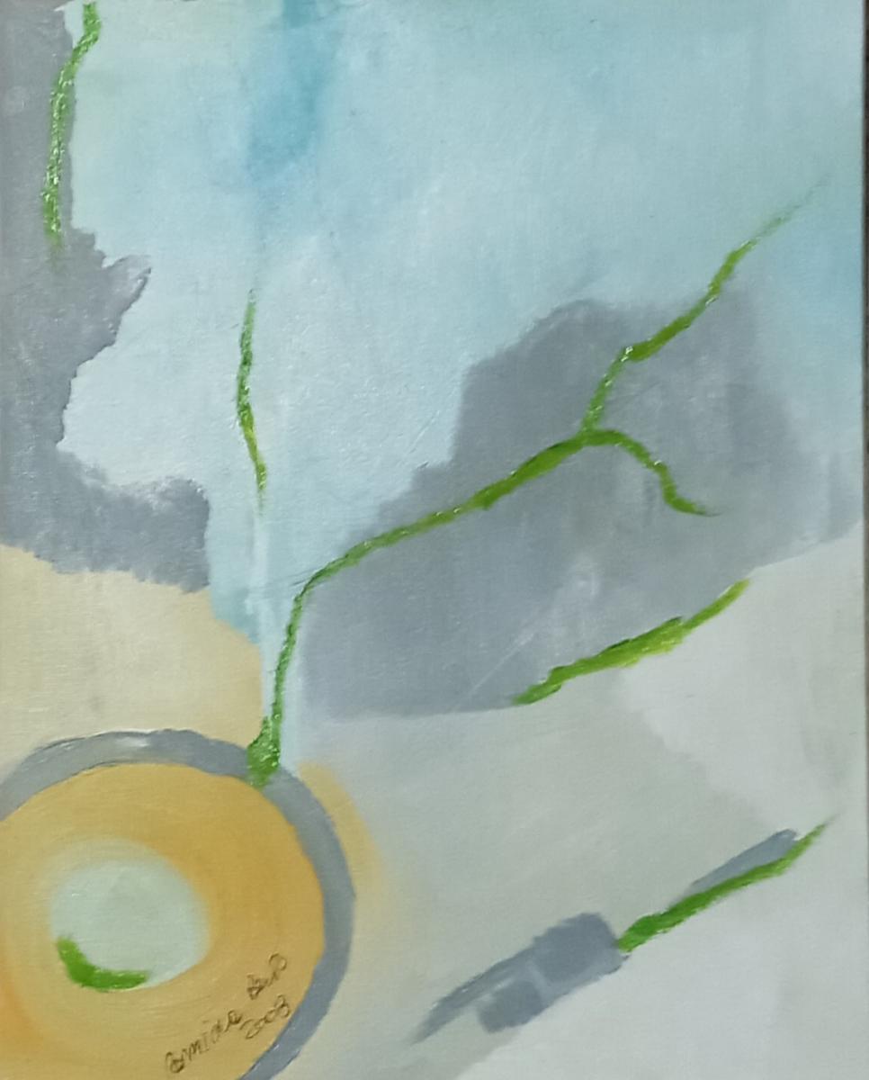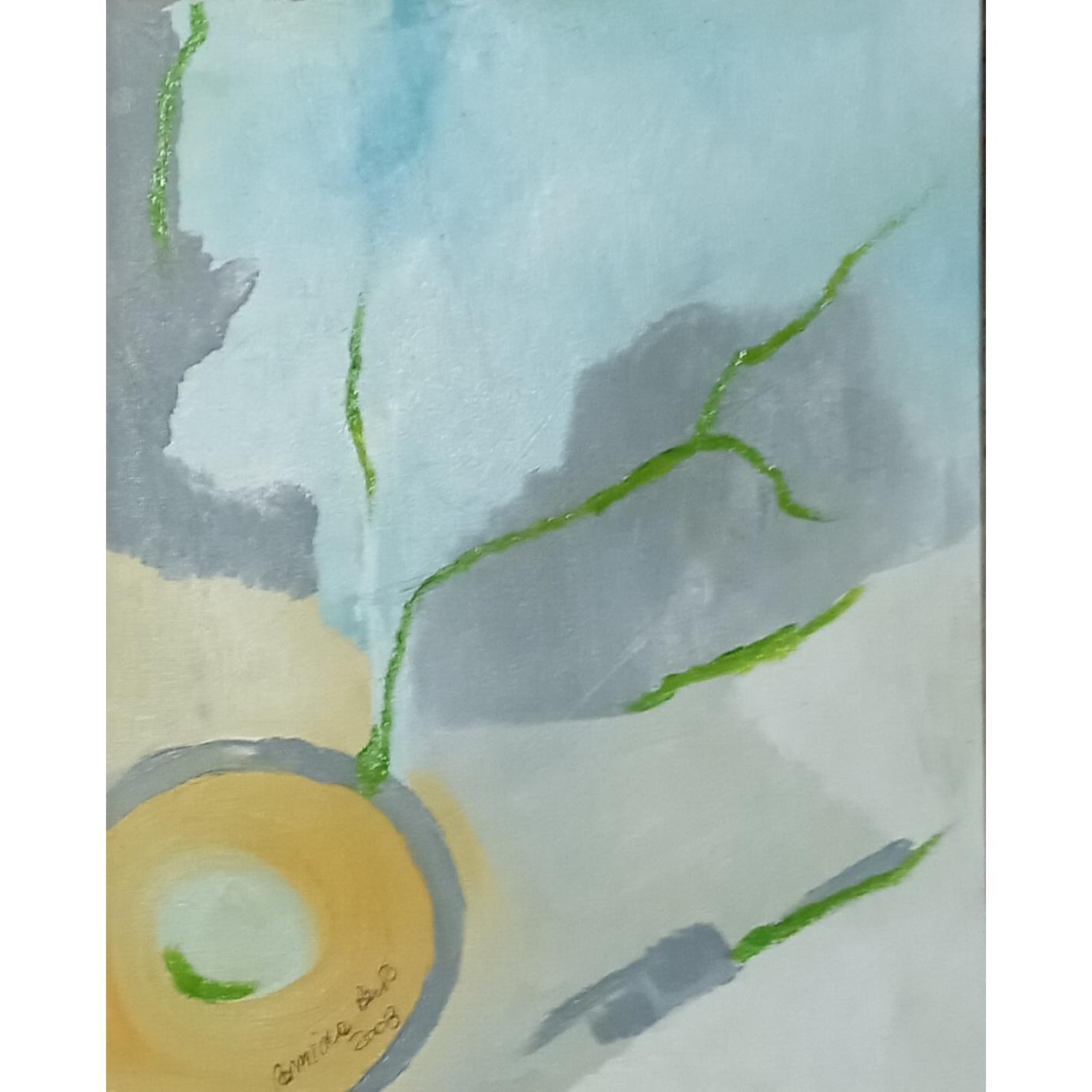 "Embrione della speranza"Anno 2008Pensiero in prima persona come fossi ioSono io. Il cerchio giallo in basso a sinistra, con il grigio attorno e il verde che esce.L’azzurro pallido sopra è cielo, è distanza, è il colore che aveva Embrione quando stavo tutta chiusa nel liquido. Qui l’uovo si è rotto. Il liquido è evaporato. È rimasto solo l’azzurro dell’aria, l’azzurro del vuoto che viene dopo. È il 2008, l’anno dell’uovo, della veste, dei riflessi, della natura rinata. L’anno in cui ho smesso di stare dentro e ho provato a stare fuori.Il grigio è cenere, è nebbia, è il colore che ha il mondo quando apri gli occhi dopo averli tenuti chiusi troppo. È il grigio di La veste che qui si fa nuvola, si fa peso, si fa “non so dove andare”. È il grigio del dopo-partorito. Perché uscire dall’uovo non è festa. È smarrimento.Il giallo è tuorlo, è centro, è l’unica cosa calda in tutto il quadro. Non è l’oro bruciante di Fox trot 2015. Non è il giallo malato di Piccolo burattinaio 2016. Questo è giallo embrione vero. È giallo uovo fresco. È giallo “non sono ancora niente ma ci sono”. Ha un bordo grigio perché anche la speranza, nel 2008, ha l’ombra. Ha un buco bianco al centro perché anche la speranza, nel 2008, ha un vuoto.Il verde è la novità. Non c’è in Embrione. Non c’è in La veste. Non c’è in Embrioni riflessi. Appare qui per la prima volta dopo Natura rinata. Ma lì era verde acqua, era verde colato, era verde che non sapeva stare in piedi. Questo è verde filo, verde nervo, verde germoglio. Esce dal giallo, taglia il grigio, sale verso l’azzurro. È sottile, è fragile, è spezzato in più punti. Ma c’è. È la prima volta che in un quadro del 2008 qualcosa va verso l’alto e non verso il basso.Dentro il cerchio giallo c’è un piccolo segno verde, curvo. È il primo movimento. È il feto che si gira. È l’idea che si forma. È il “e se provassi” che per anni non ho avuto il coraggio di pensare. È minuscolo. Se non guardi bene non lo vedi. Ma c’è.Il pensiero critico è questo: Embrione della speranza viene dopo La veste. Lì ero svuotata, ero solo stoffa appesa ai rami blu. Qui torno a essere uovo, ma uovo con una differenza: ha il cordone verde. Ha il legame con fuori. Ha la voglia di uscire che non è solo paura.Vengo da Embrioni riflessi dove ero doppia, spaccata, sopra e sotto. Qui sono una sola, e sto in basso a sinistra. Non occupo più tutto il quadro. Non pretendo più di essere il centro. Sto in un angolo, piccola, ma con le radici che provano a salire. Perché la speranza, nel 2008, non è esplosione. È filo verde. È traccia. È l’ostinazione di un colore che nel grigio decide di nascere lo stesso.Non c’è rosso qui.Non c’è nero qui.Non c’è sangue qui.Perché la speranza, quando è embrione, non sanguina.Respira appena. Questo è l’ultimo quadro del 2008, dopo l’uovo, dopo la veste, dopo i riflessi, dopo la natura colata.È il punto in cui dico: va bene, sono rotta, sono vuota, sono veste appesa.Però dentro il giallo c’è un segno verde.E quel segno verde non chiede permesso.Sale. Sono embrione della speranza perché ho smesso di aspettare di essere salvata.Ho iniziato a farmi filo verde da sola.E a salire.