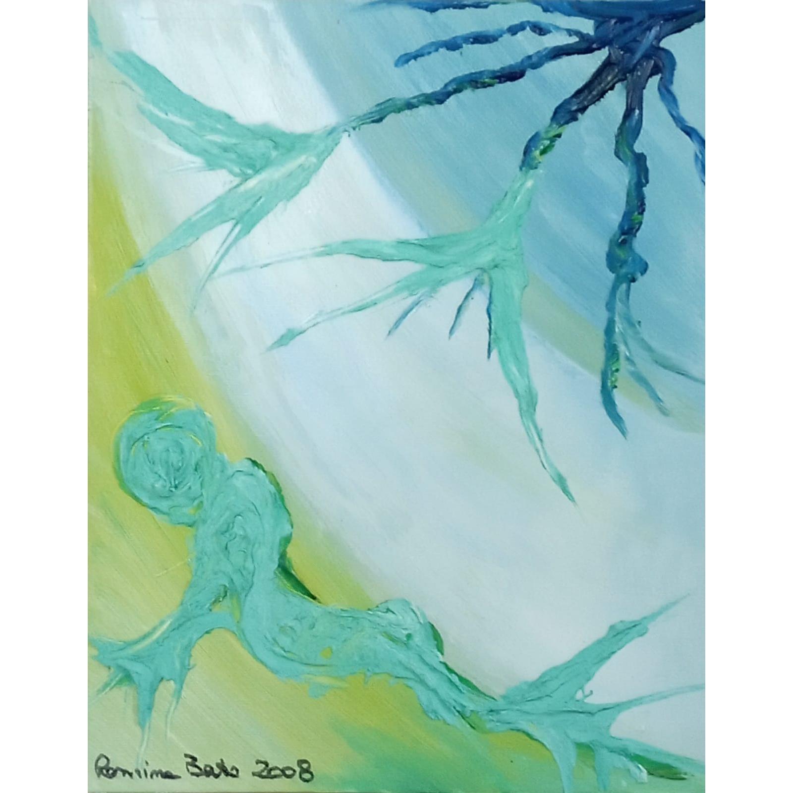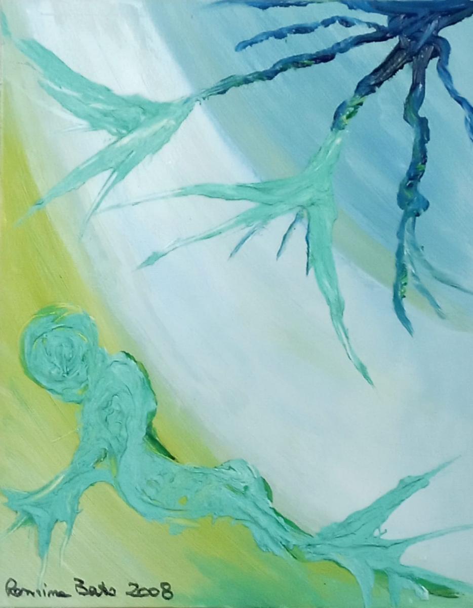 "Embrione della speranza"Anno 2008Pensiero in prima persona come fossi ioSono io. Il cerchio giallo in basso a sinistra, con il grigio attorno e il verde che esce.L’azzurro pallido sopra è cielo, è distanza, è il colore che aveva Embrione quando stavo tutta chiusa nel liquido. Qui l’uovo si è rotto. Il liquido è evaporato. È rimasto solo l’azzurro dell’aria, l’azzurro del vuoto che viene dopo. È il 2008, l’anno dell’uovo, della veste, dei riflessi, della natura rinata. L’anno in cui ho smesso di stare dentro e ho provato a stare fuori.Il grigio è cenere, è nebbia, è il colore che ha il mondo quando apri gli occhi dopo averli tenuti chiusi troppo. È il grigio di La veste che qui si fa nuvola, si fa peso, si fa “non so dove andare”. È il grigio del dopo-partorito. Perché uscire dall’uovo non è festa. È smarrimento.Il giallo è tuorlo, è centro, è l’unica cosa calda in tutto il quadro. Non è l’oro bruciante di Fox trot 2015. Non è il giallo malato di Piccolo burattinaio 2016. Questo è giallo embrione vero. È giallo uovo fresco. È giallo “non sono ancora niente ma ci sono”. Ha un bordo grigio perché anche la speranza, nel 2008, ha l’ombra. Ha un buco bianco al centro perché anche la speranza, nel 2008, ha un vuoto.Il verde è la novità. Non c’è in Embrione. Non c’è in La veste. Non c’è in Embrioni riflessi. Appare qui per la prima volta dopo Natura rinata. Ma lì era verde acqua, era verde colato, era verde che non sapeva stare in piedi. Questo è verde filo, verde nervo, verde germoglio. Esce dal giallo, taglia il grigio, sale verso l’azzurro. È sottile, è fragile, è spezzato in più punti. Ma c’è. È la prima volta che in un quadro del 2008 qualcosa va verso l’alto e non verso il basso.Dentro il cerchio giallo c’è un piccolo segno verde, curvo. È il primo movimento. È il feto che si gira. È l’idea che si forma. È il “e se provassi” che per anni non ho avuto il coraggio di pensare. È minuscolo. Se non guardi bene non lo vedi. Ma c’è.Il pensiero critico è questo: Embrione della speranza viene dopo La veste. Lì ero svuotata, ero solo stoffa appesa ai rami blu. Qui torno a essere uovo, ma uovo con una differenza: ha il cordone verde. Ha il legame con fuori. Ha la voglia di uscire che non è solo paura.Vengo da Embrioni riflessi dove ero doppia, spaccata, sopra e sotto. Qui sono una sola, e sto in basso a sinistra. Non occupo più tutto il quadro. Non pretendo più di essere il centro. Sto in un angolo, piccola, ma con le radici che provano a salire. Perché la speranza, nel 2008, non è esplosione. È filo verde. È traccia. È l’ostinazione di un colore che nel grigio decide di nascere lo stesso.Non c’è rosso qui.Non c’è nero qui.Non c’è sangue qui.Perché la speranza, quando è embrione, non sanguina.Respira appena. Questo è l’ultimo quadro del 2008, dopo l’uovo, dopo la veste, dopo i riflessi, dopo la natura colata.È il punto in cui dico: va bene, sono rotta, sono vuota, sono veste appesa.Però dentro il giallo c’è un segno verde.E quel segno verde non chiede permesso.Sale. Sono embrione della speranza perché ho smesso di aspettare di essere salvata.Ho iniziato a farmi filo verde da sola.E a salire.